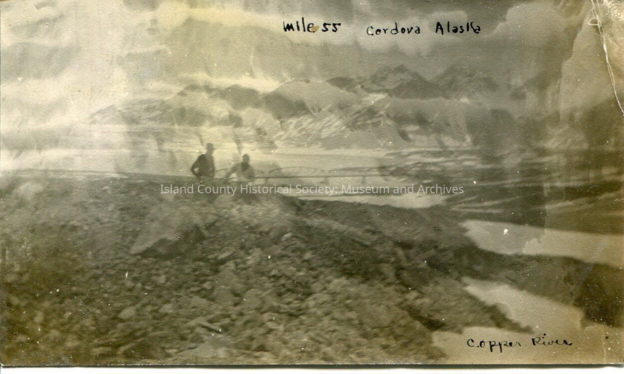 A photo of two people, one at least is a man. They are behind a big rock beside a river, bridge and mountains in the background. On the front: "Mile 55 Cordova Alaska Copper River". Might be related to 2015.074.665-.666.