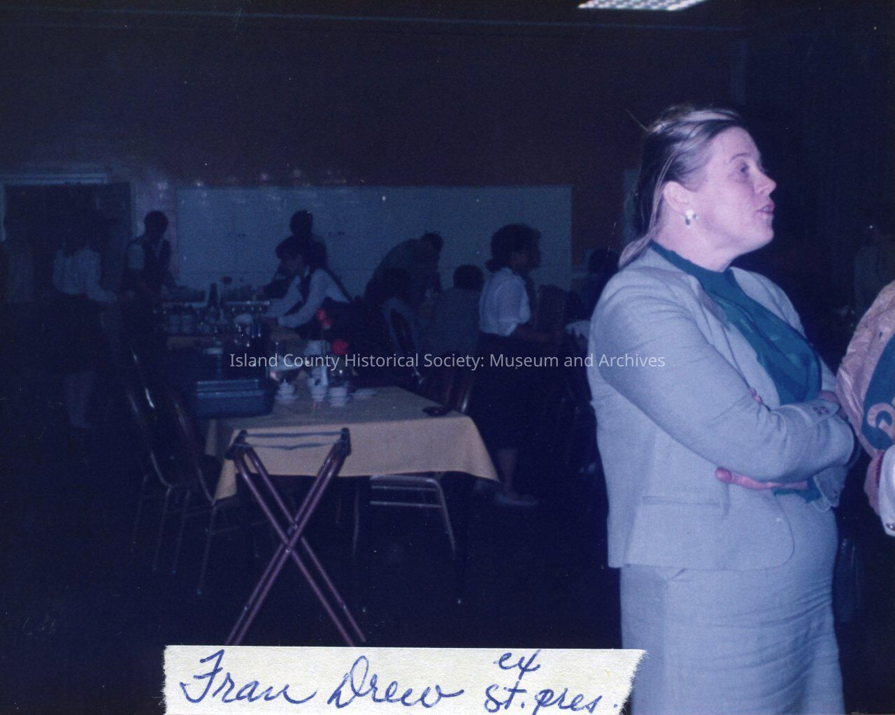 League of Women Voters of Whidbey Island. Woman at right speaks to unseen person. Tables in background. Back reads: Fran Drew, Former State President. On USLWV Board. Council-1984-Ellensburg.