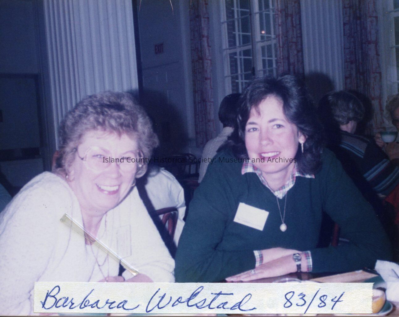 League of Women Voters of Whidbey Island. Two women sitting at table with others in background. Back reads: Barbara Wolstad and friend. State Memb. Chairman 83-84. Council-Ellensburg.
