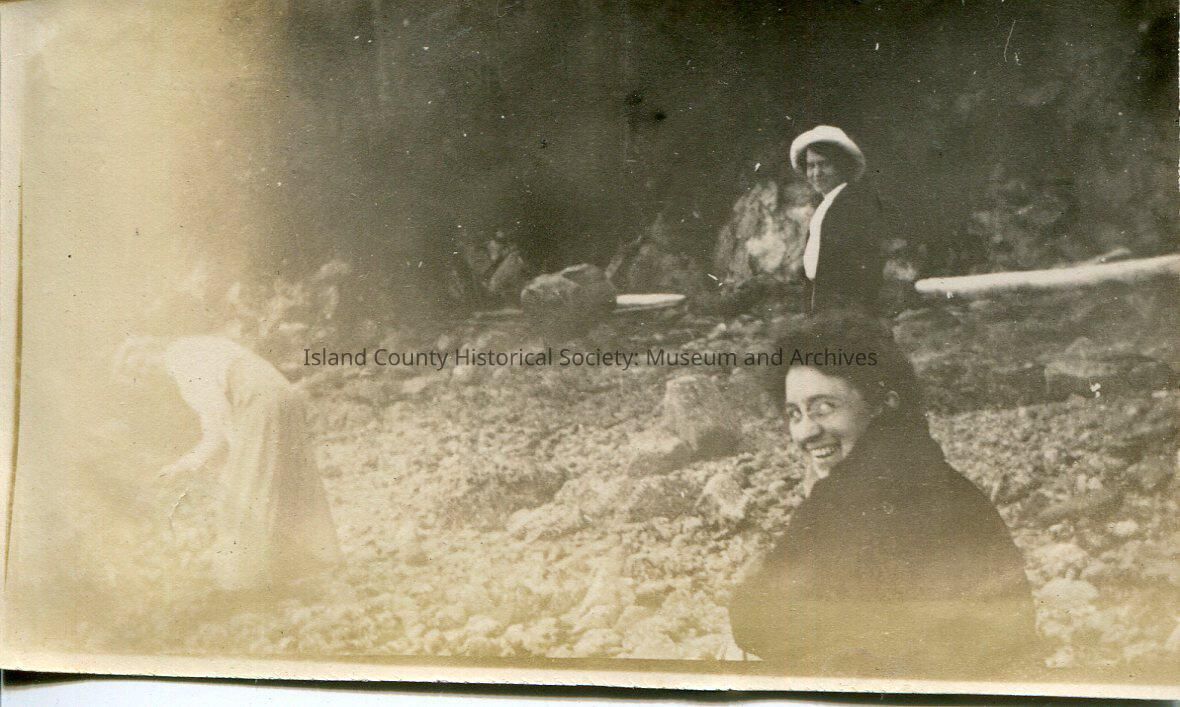 A photo of two or three women or two women and a man. On a rocky shore line. Wearing dresses or skirts, one wearing a hat. Related to 2015.074.665-.666. Might be related to 2015.074.664.