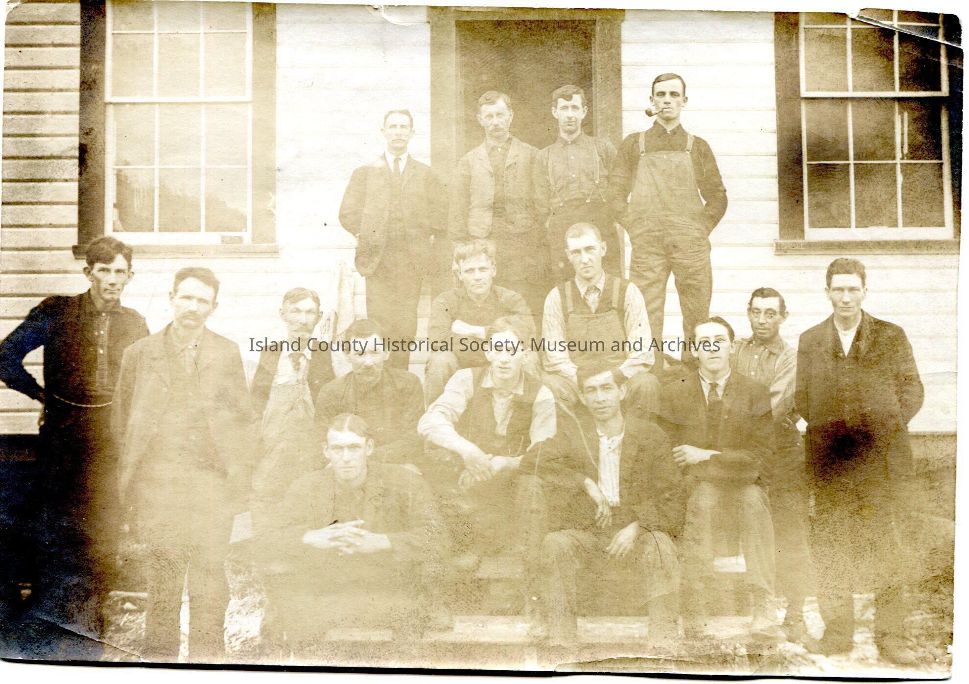 A group of sixteen men sitting and standing for a photograph on the steps of a Fort Casey building. Written on the back: "1907 Fort Base Wash."