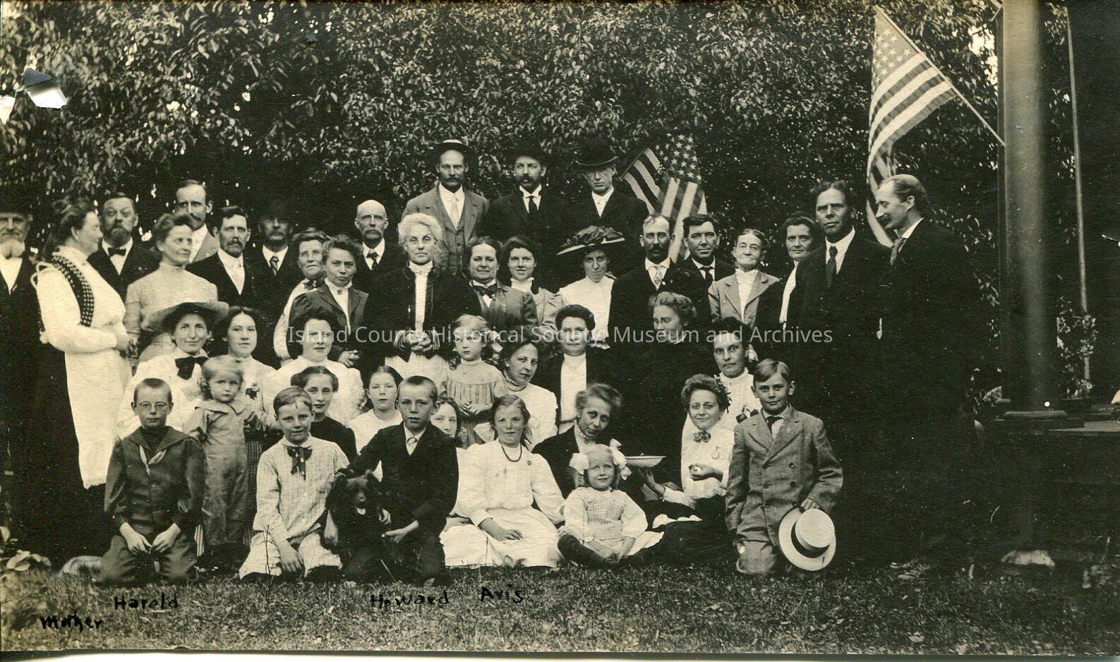 A photo of a group of men, women and children all dressed up, two American flags waving, one from a pole. Suits, dresses, hats. Four rows, two standing, two rows kneeling or sitting on the ground. On the bottom under specific people: "Mother Harold Howard Avis". Howard is holding a large dog along his right side.Lexicon