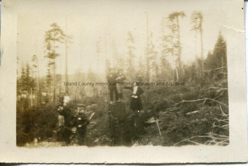 A photo of a group of men and women posting on or near tree stumps in a logged area. There are a few trees still standing.