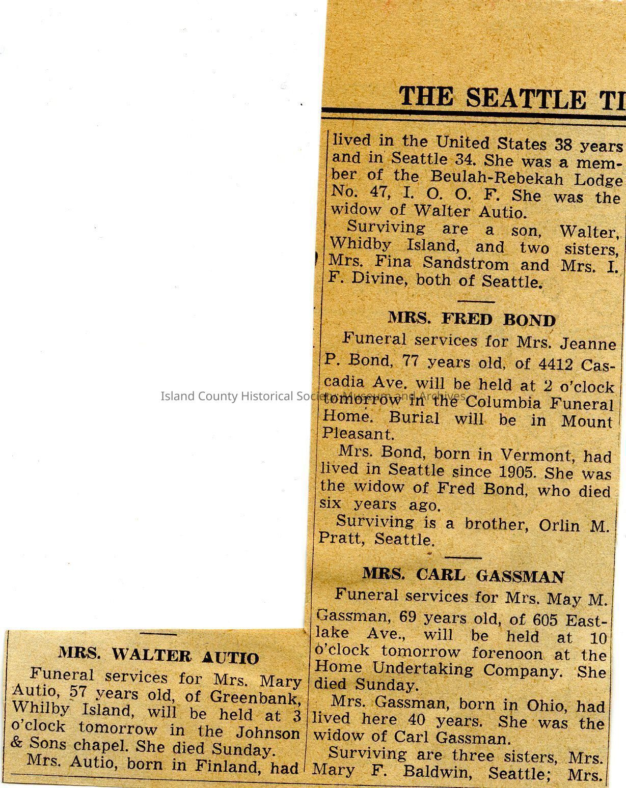 Newspaper clipping from The Seattle Times. "Mrs Walter Autio" aka Mary Autio's obituary (extended). Clipping also includes Mrs Fred Bond and Mrs Carl Gassman obituaries.