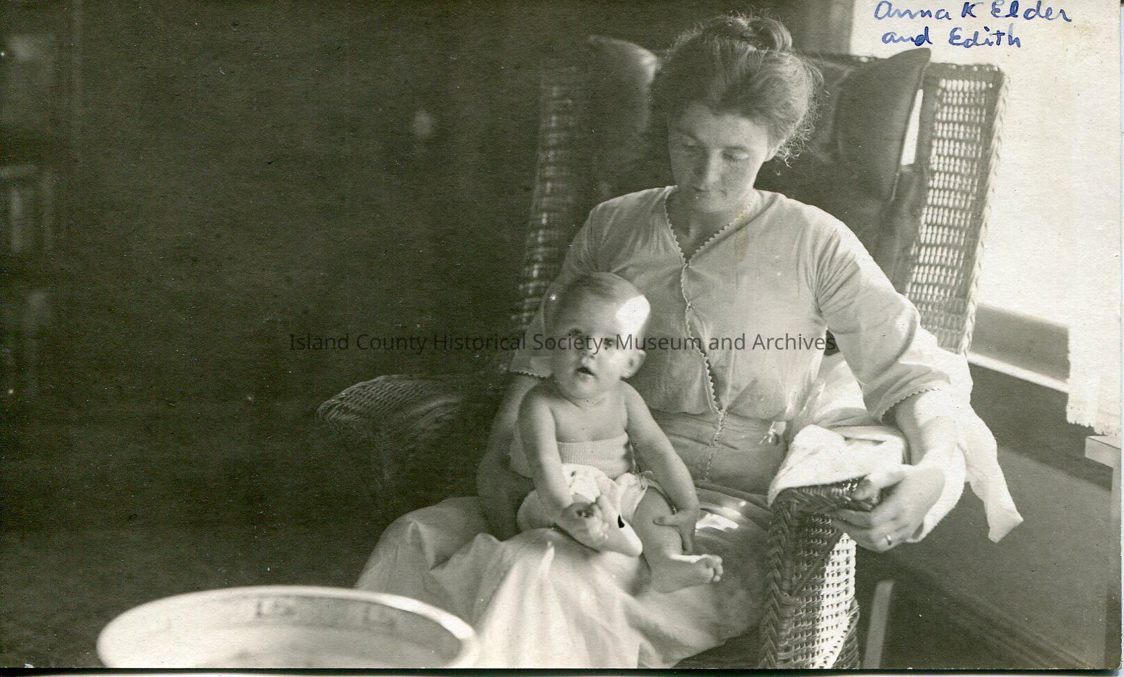 A postcard of a woman in a wicker rocker holding a baby in a cloth diaper. On the top right: "Anna K. Elder and Edith". The postvard is dated 1904-1918.