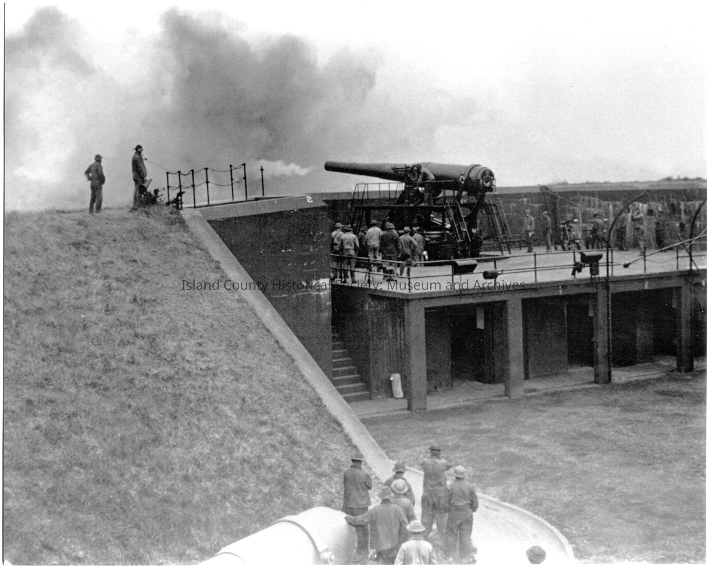 Grayscale image of a test-firing of one of the nine-inche disappearing gun. Soldiers stand around and observe. A smoke cloud fills the air. Written on the back: "1915 - LEE ORIN SICKELS 1921 COPYED BY RICH VAUGHN 1994"