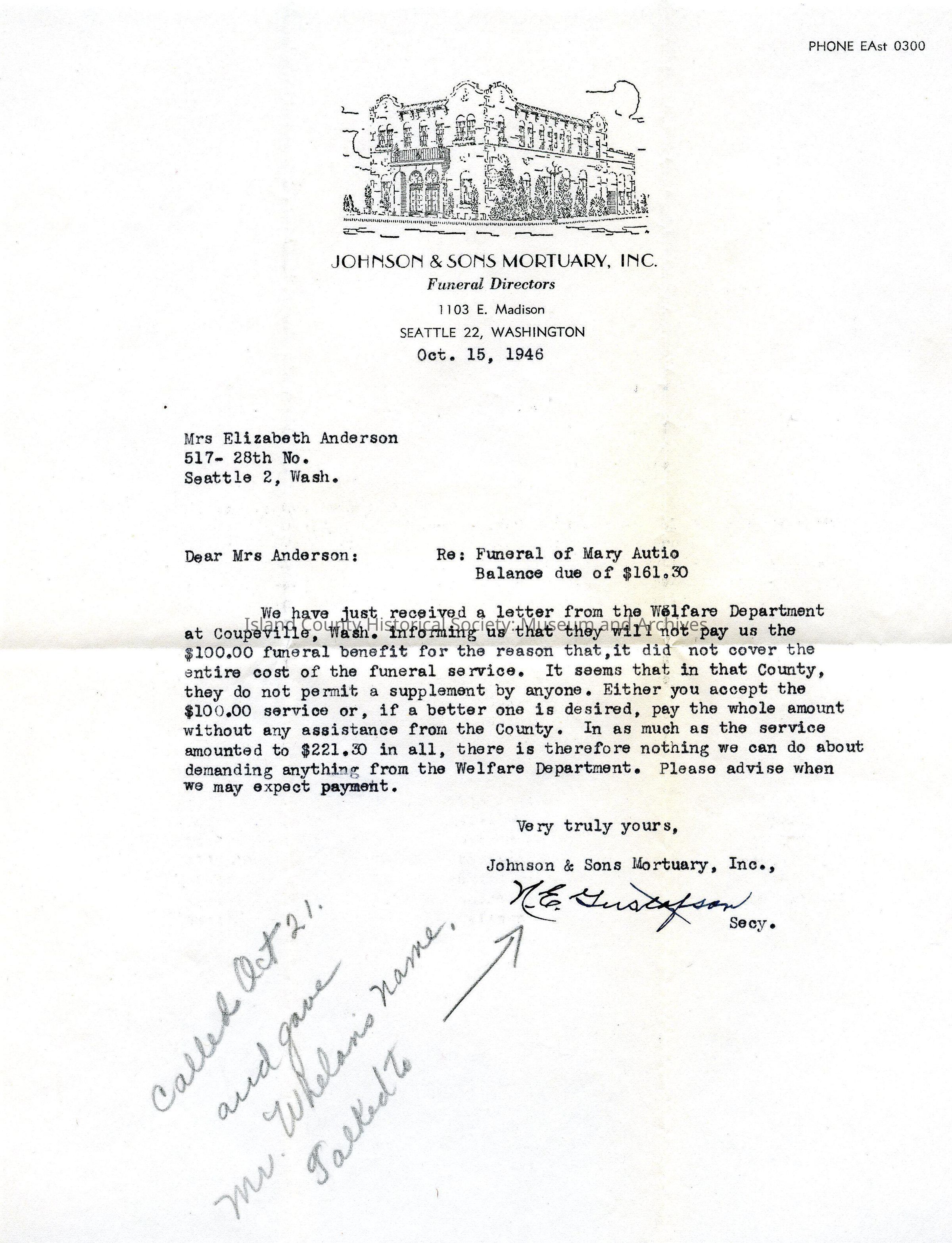 Letter from Johnson & Sons Mortuary Inc to Elizabeth Anderson dated October 15 1946 regarding the funeral of Mary Autio. They inform her that the Coupeville Welfare Dept. will not cover the funeral fees and are expecting payment somehow. Scrawled note in pencil "Called October 21..."