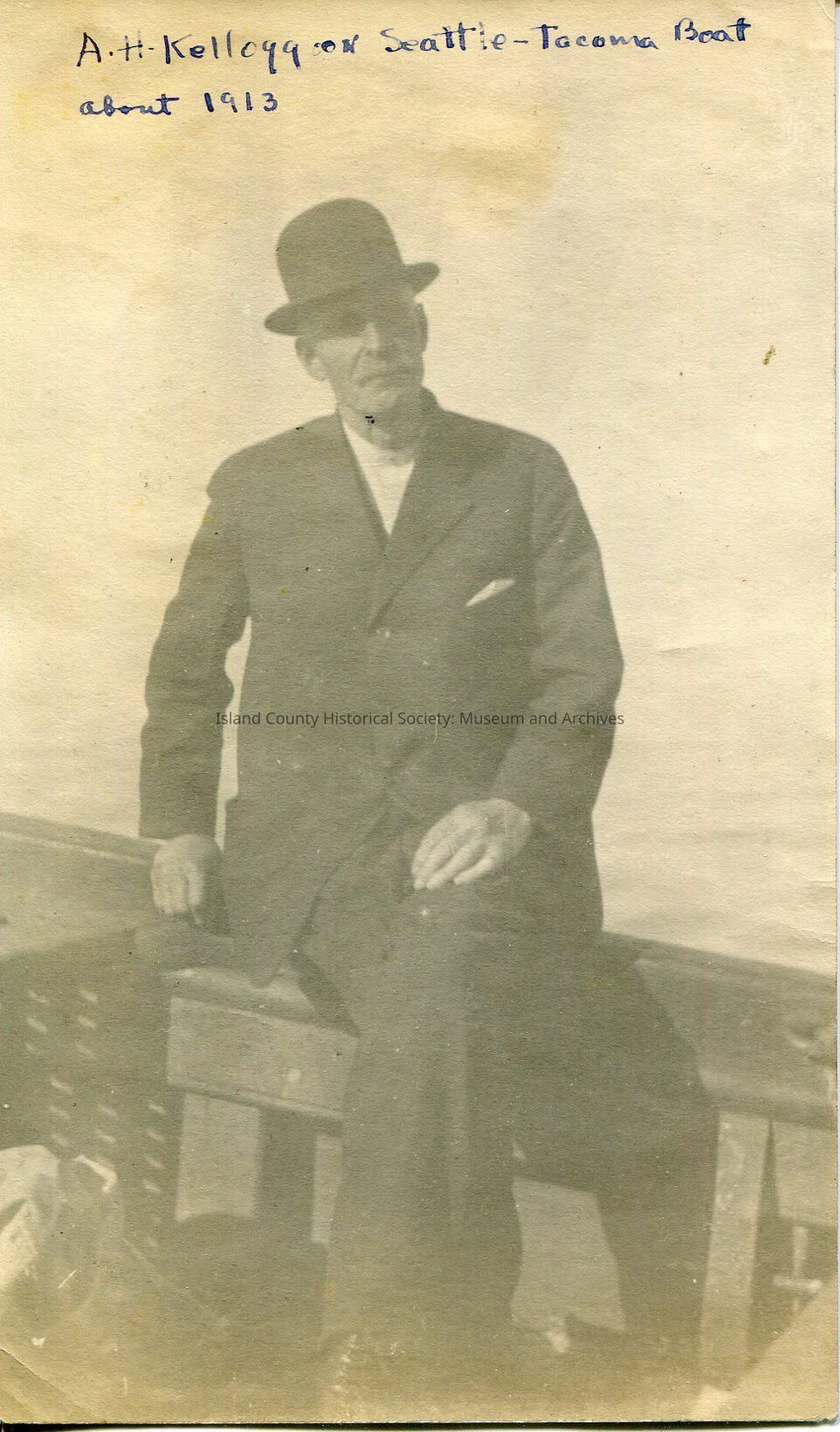 A photo of an older man sitting on the side of a boat. The man is wearing a suit and hat. He also has a moustashe. The background is water. The top of the photo says, "A.H. Kellogg on Seattle-Tacome boat about 1913". The back of the photo says, "Taken on boat coming up".