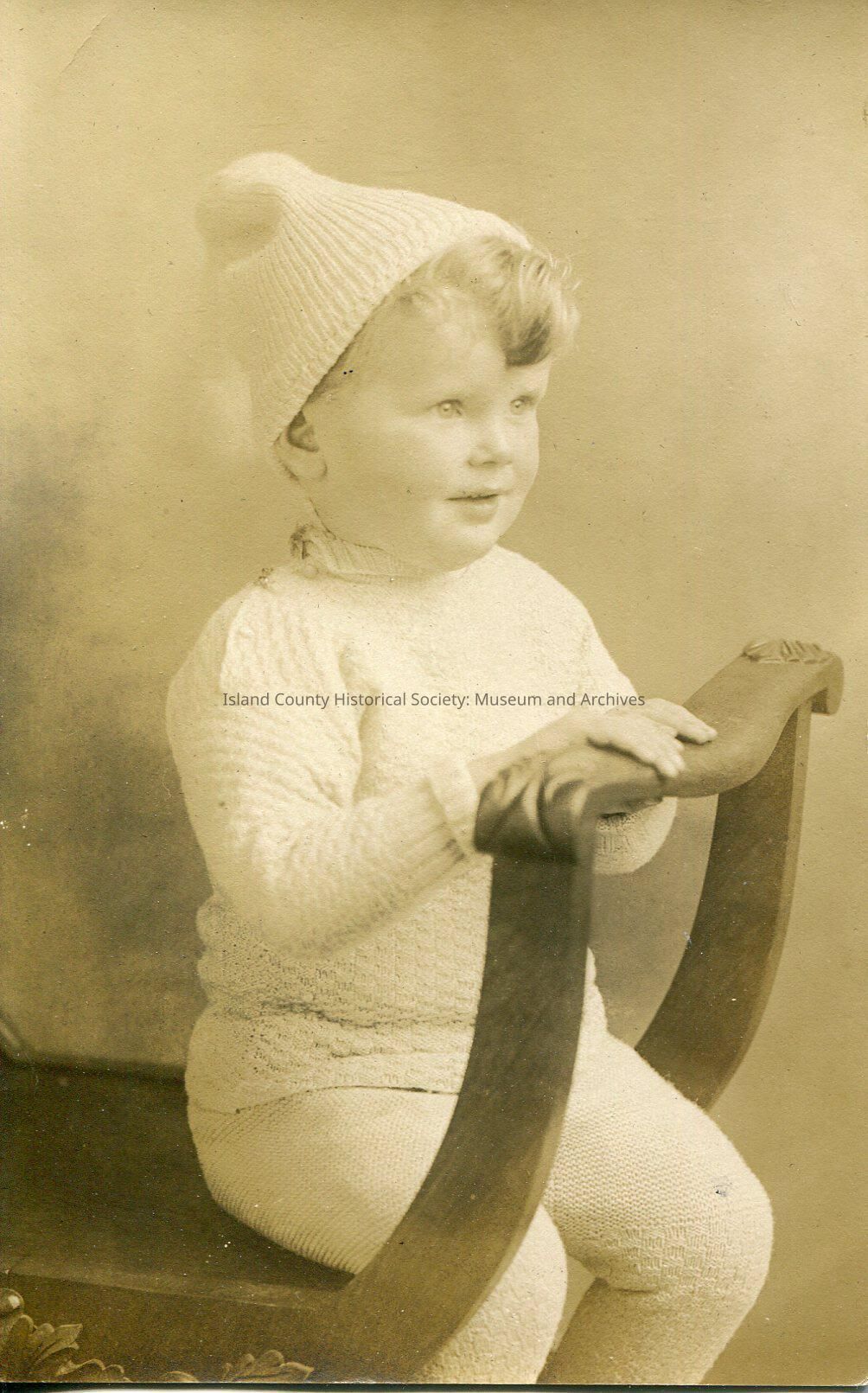 A post card featuring a young boy sitting on wooden chair/prop. His hands are resting on a wooden arm-rest. The boy is wearing a white, knit outfit and hat. He is looking away from the camera. Frederick Miller, son of Alice Kellogg Miller (later Cahail) buried at Sunnyside Cemetery with his grandparents, Albert Kellogg and Edith Dillon.Lexicon