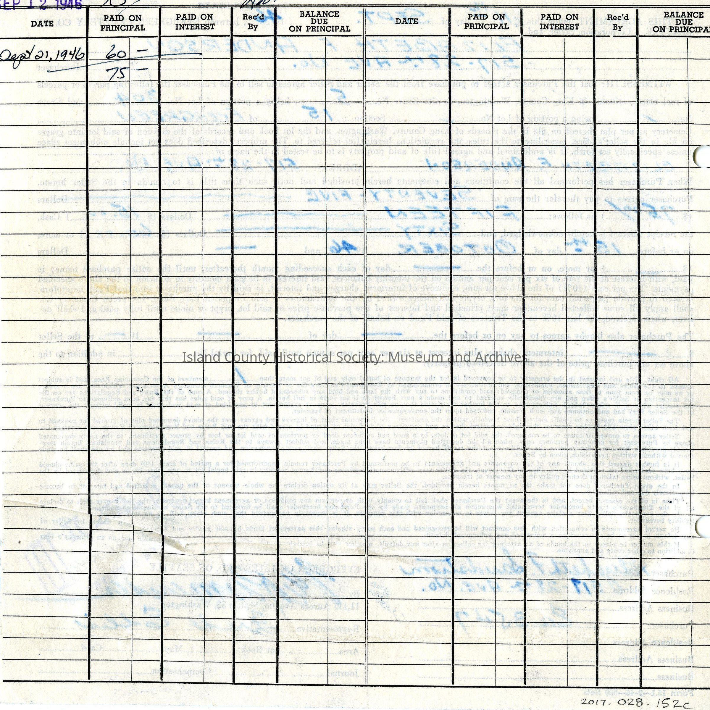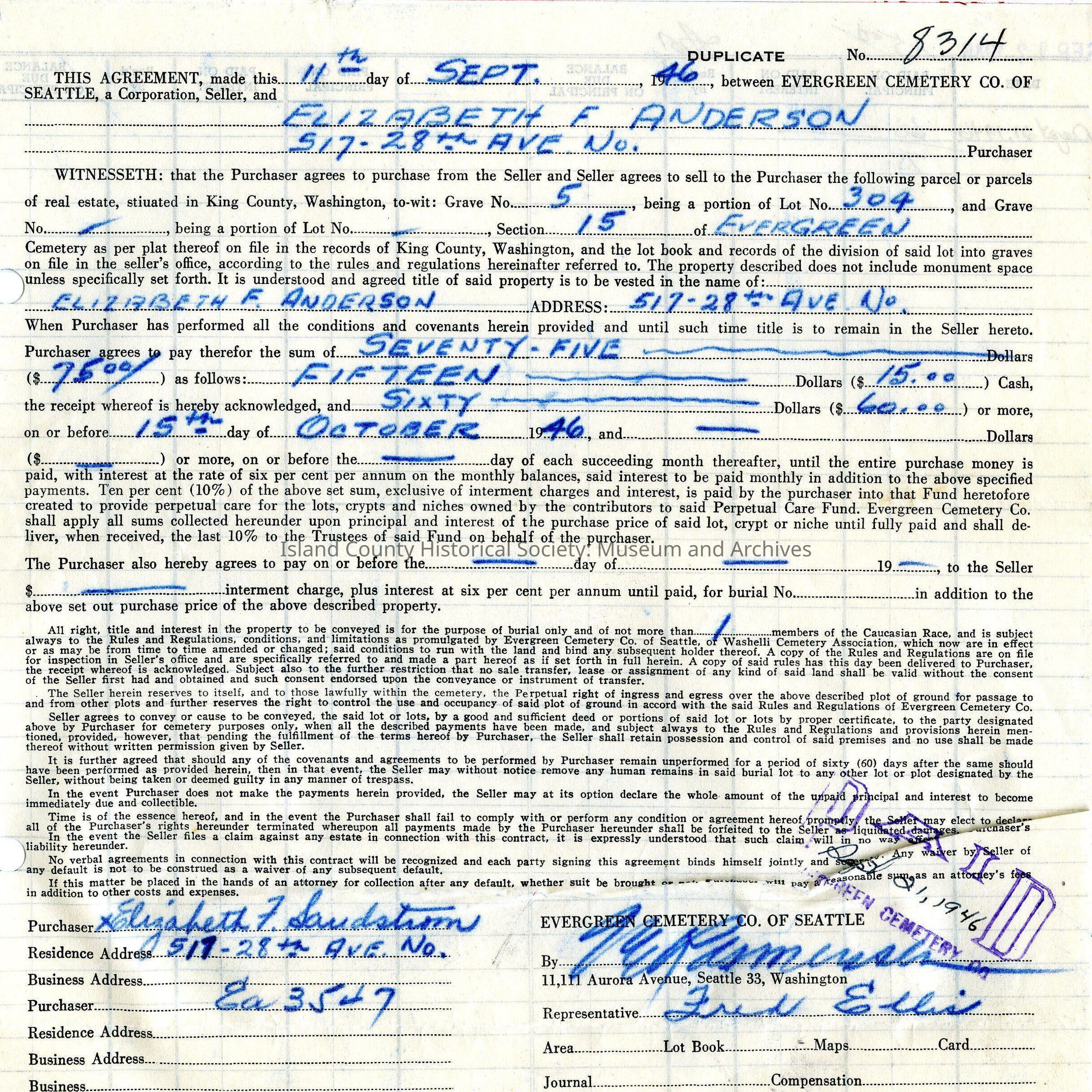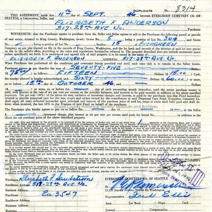 Contract/agreement between Evergreen Cemetery Co and Elizabeth Anderson purchasing a grave for Mary Autio. Includes cost. Small black print with dotted lines mostly filled in with blue inked writing. Hole punched on one side. Stamped "PAID" in purple ink lower right corner.