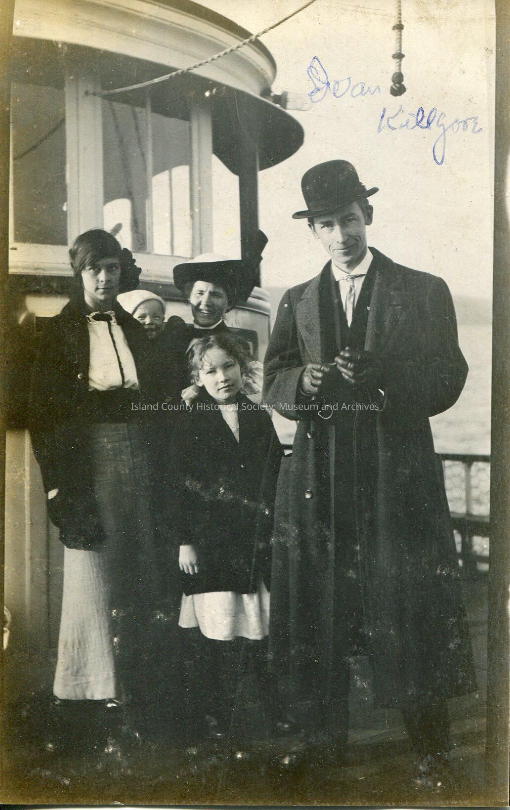 A black and white post card of a group of five. There is one adult male, two adult women, a young girl, and a baby. The photo was taken on a boat. The man is wearing a suit and tie, a long jacket and a hat. The women are all wearing dresses and jackets. The woman holding the baby is wearing a hat. The top of the photo says, "Ivan Killgooe" (?). There is a lot of writing on the back of the postcard.Lexicon