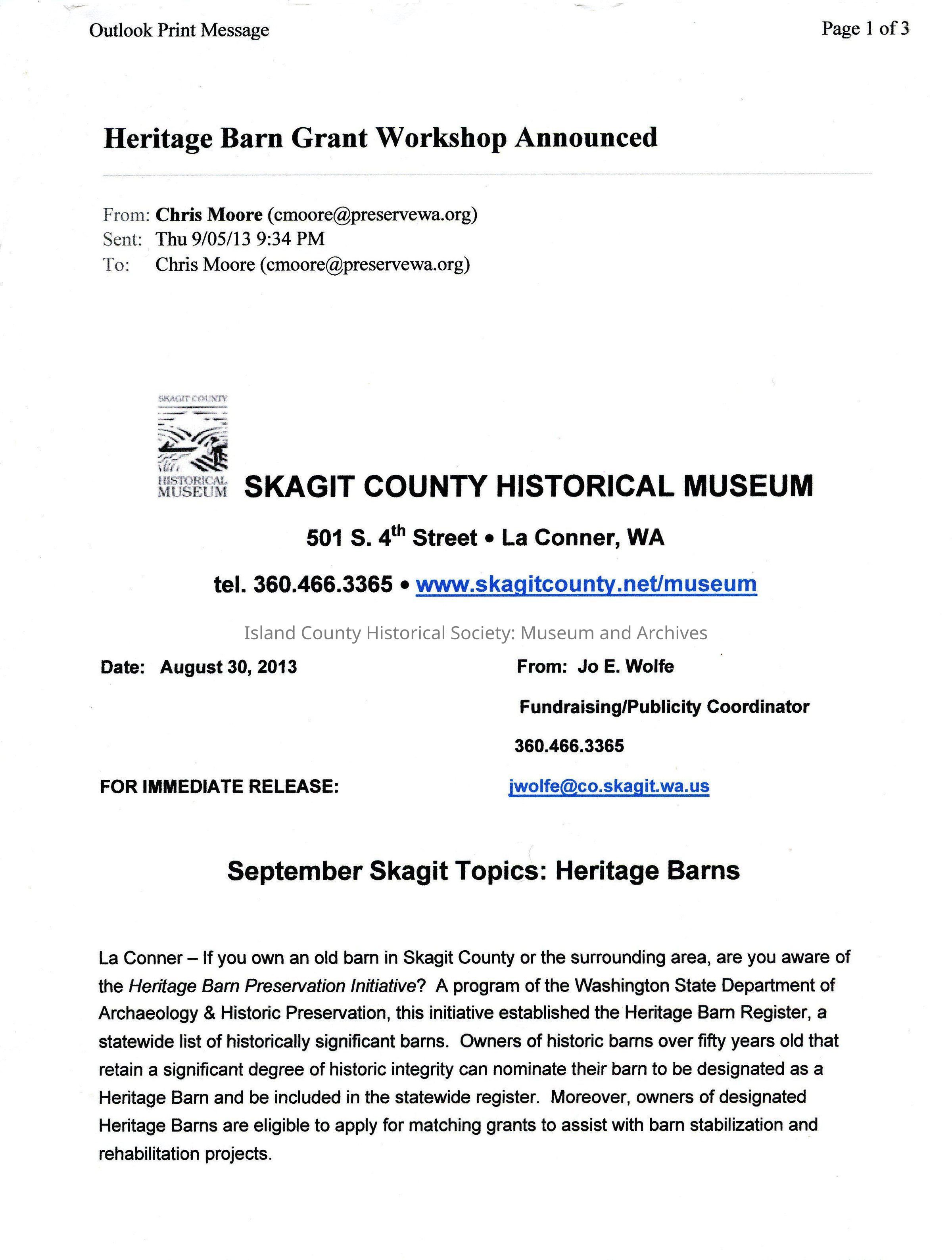 Printed email letter (Outlook- Microsoft) sent from Chris Moore (Washington Trust for Historic Preservation). Entitled "Heritage Barn Grant Workshop Announced". Organised by the Skagit County Historical Museum (LaConner). Gives contact details of promoter/organiser. Encourages people who own historic barns in Washington to take advantage of a grant scheme to preserve their barns.