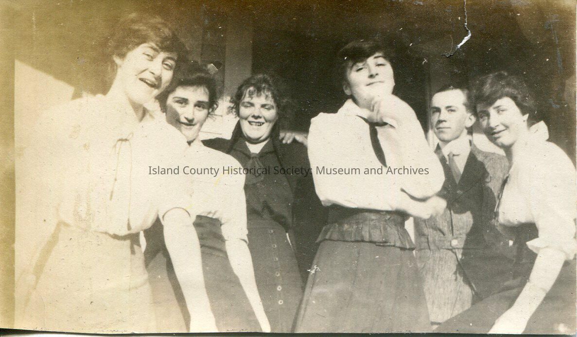A photo of a group of people. There are five women and one man. The women are all wearing dresses or skirts and they all have their hair pulled back. The man is wearing a suit and tie. Everyone is smiling at the camera.