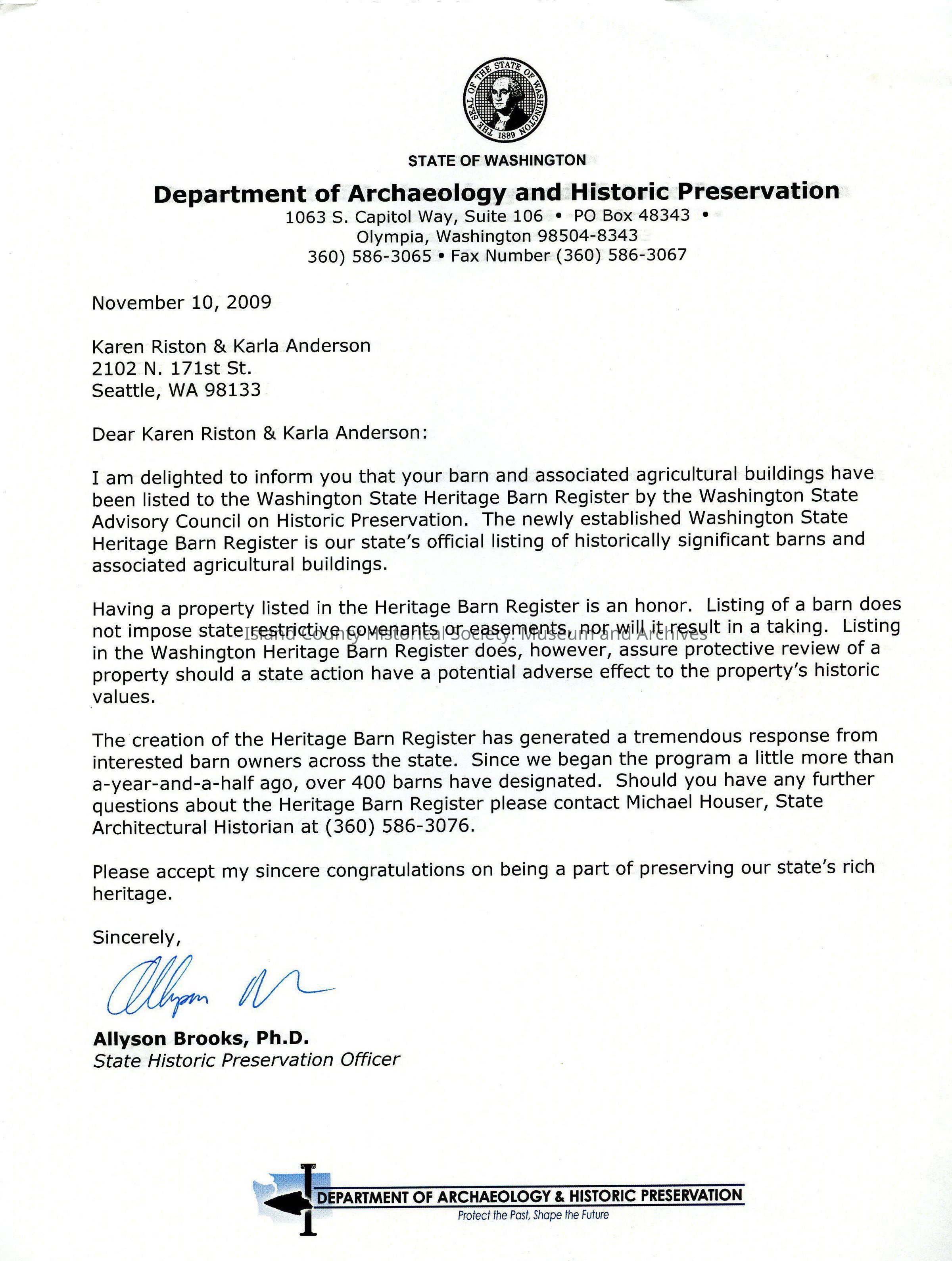 Letter on white A4 paper from Department of Archaeology and Historic Preservation (Washington State Government) to Karen Riston and Karla Anderson dated November 10, 2009. Informs them that their barn has been listed as a state heritage barn, which provides some protection if it falls under any "potential adverse effect". Provides a brief history of the register and contact details for more information.