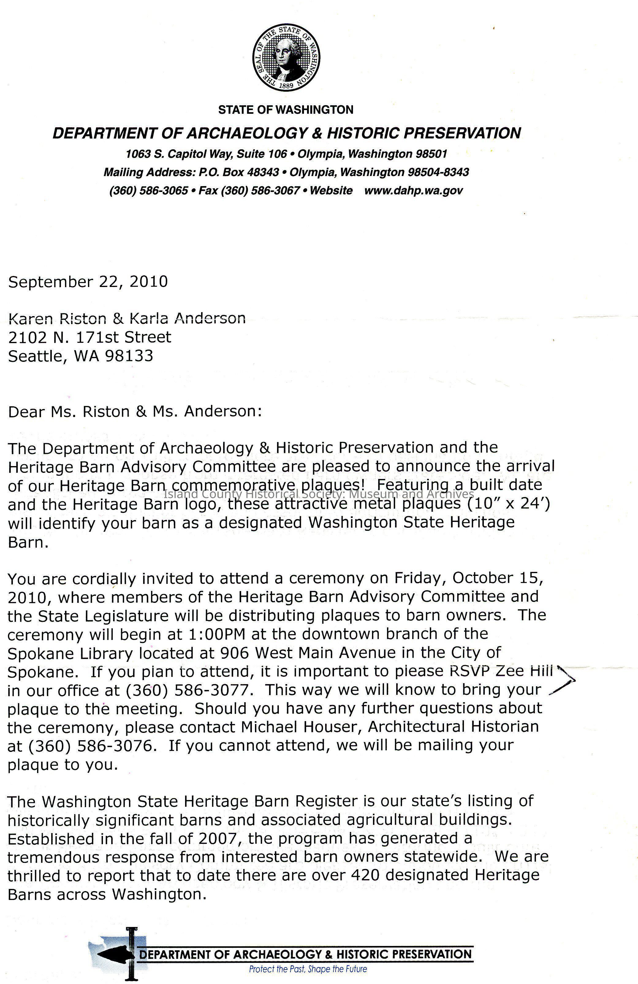 Letter (page 1) on white A4 paper from Department of Archaeology and Historic Preservation to Karen Riston and Karla Anderson dated September 22 2010. Informs them of commemorative plaques being issued. Invites them to the plaque ceremony with info details on the event and who to contact. Provides brief description of the barn register.