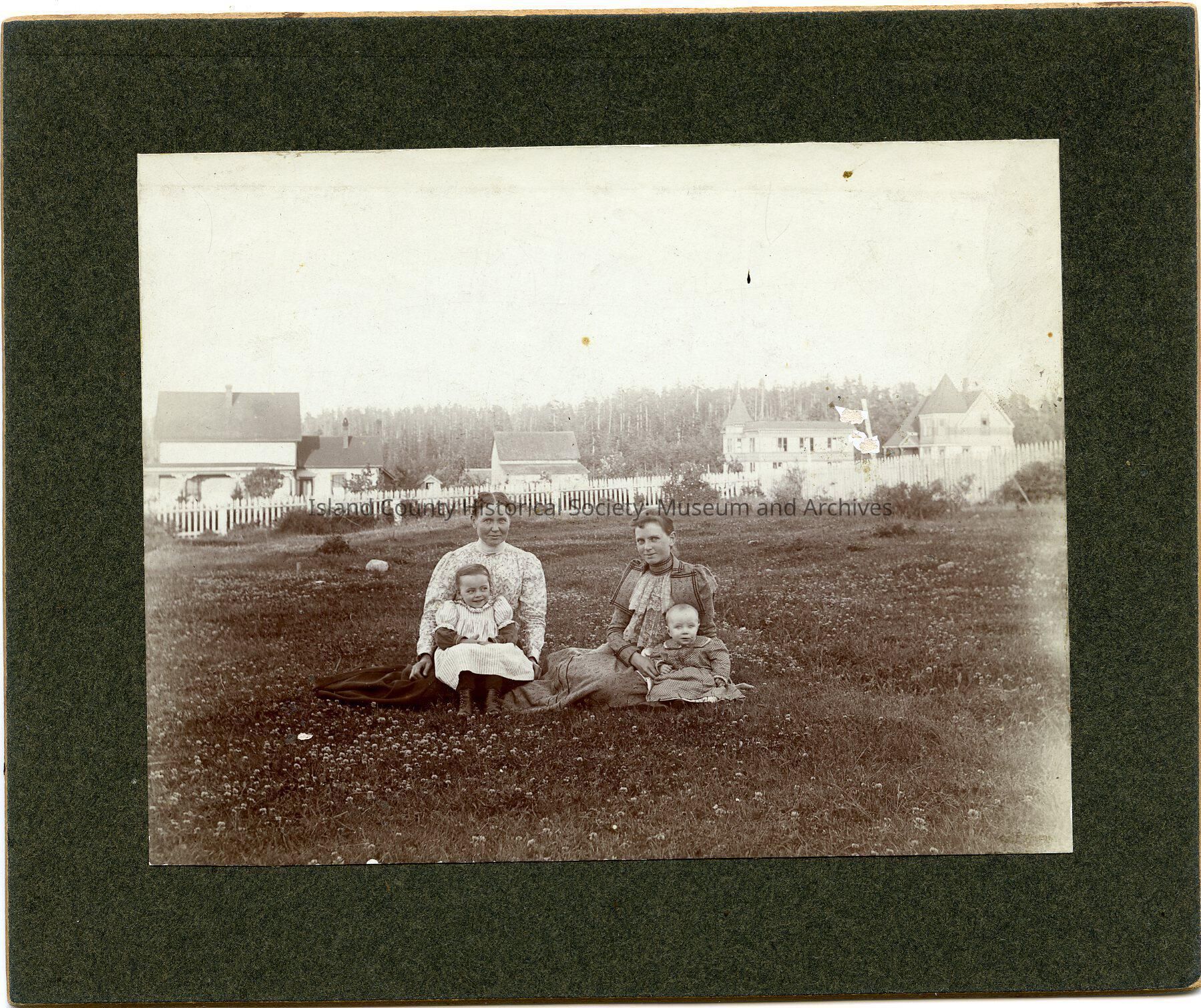 Photo of two women and two young children sitting on the grass. The little girl is sitting on one woman's lap while the toddler is sitting on the left of the woman. A bit behind them is a white picket fence and houses. Written on the back: Coupeville, WN, Mary Jane Anderson, Ida May VanOlinda, F. Myrtle VanOlinda, A. Eugene VanOlinda, 1901Made/Created