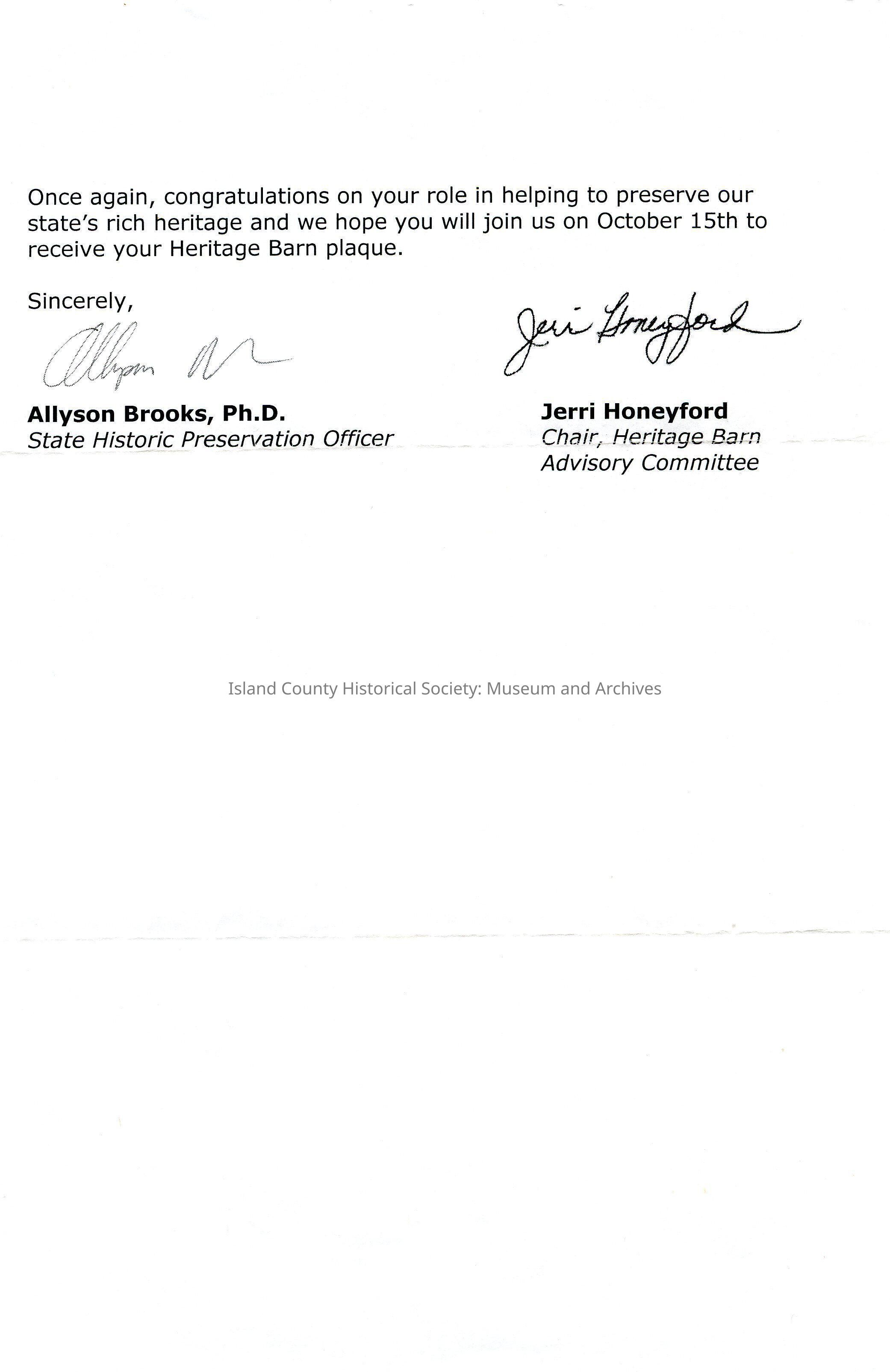 Letter (page 2) on white A4 paper from Department of Archaeology and Historic Preservation to Karen Riston and Karla Anderson dated September 22 2010 (see 2017.028.161a). Ending of letter offering congratulations and hopes of their attendance at plaque ceremony.