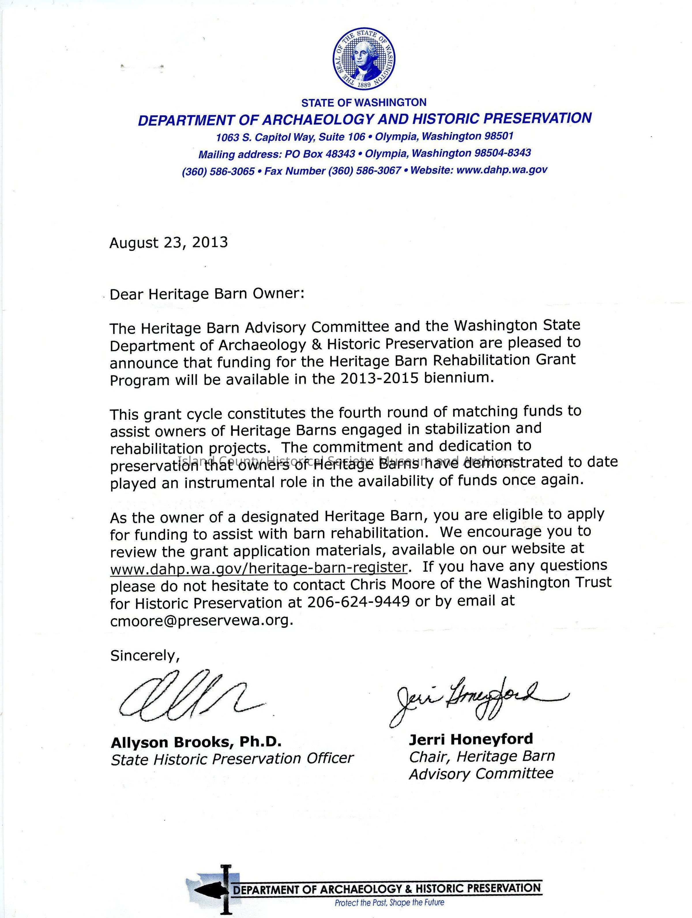 Letter from Washington State Dept. of Archaeology and Historic Preservation to "Heritage Barn Owner" dated August 23 2013. Announces Heritage Barn Rehabilitation Grant Program availability from 2013 to 2015. Informs them of their eligibility and encourages them to apply. Provides info on how to learn more. Printed on A4 white paper.