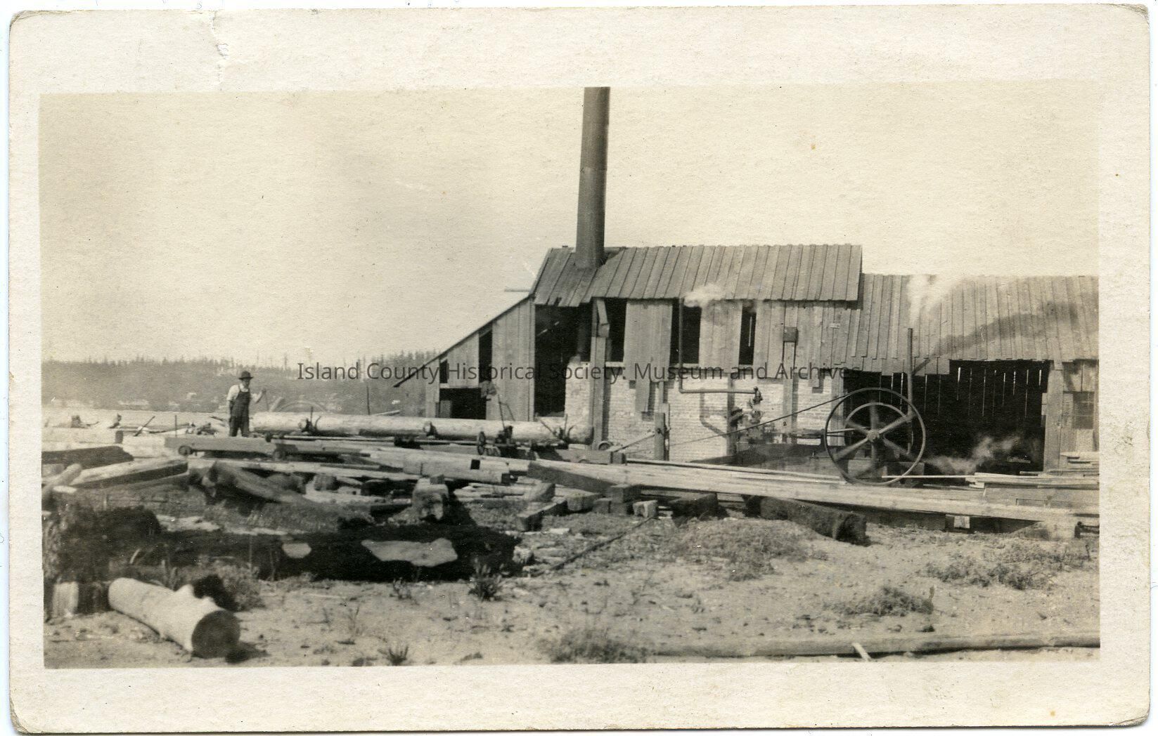 Postcard of a sawmill. Logs and machinery in front of the mill. Water in the background. Written on the back: Otto Van Dyk and Pat Sullivan down at City Beach between 1900-1910.Collection