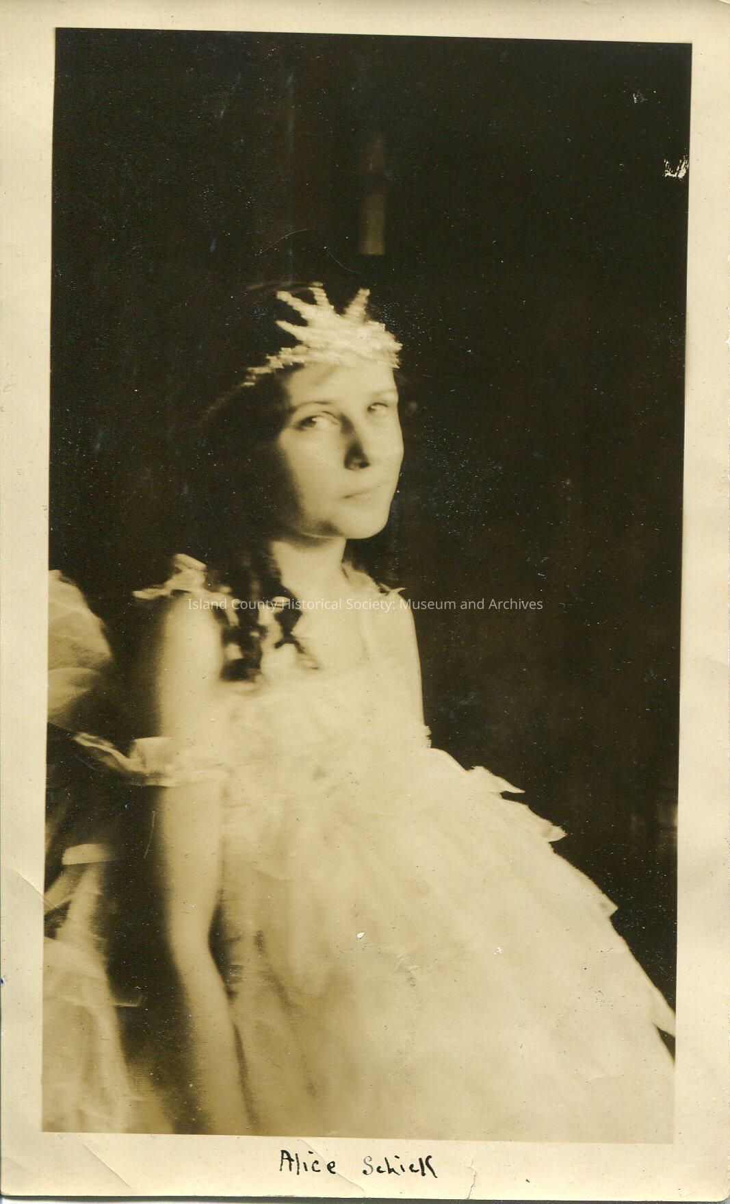 A photo of a young woman in a white dress. She has a beaded headband/head piece on. The bottom of the photo says, "Alice Schick".
