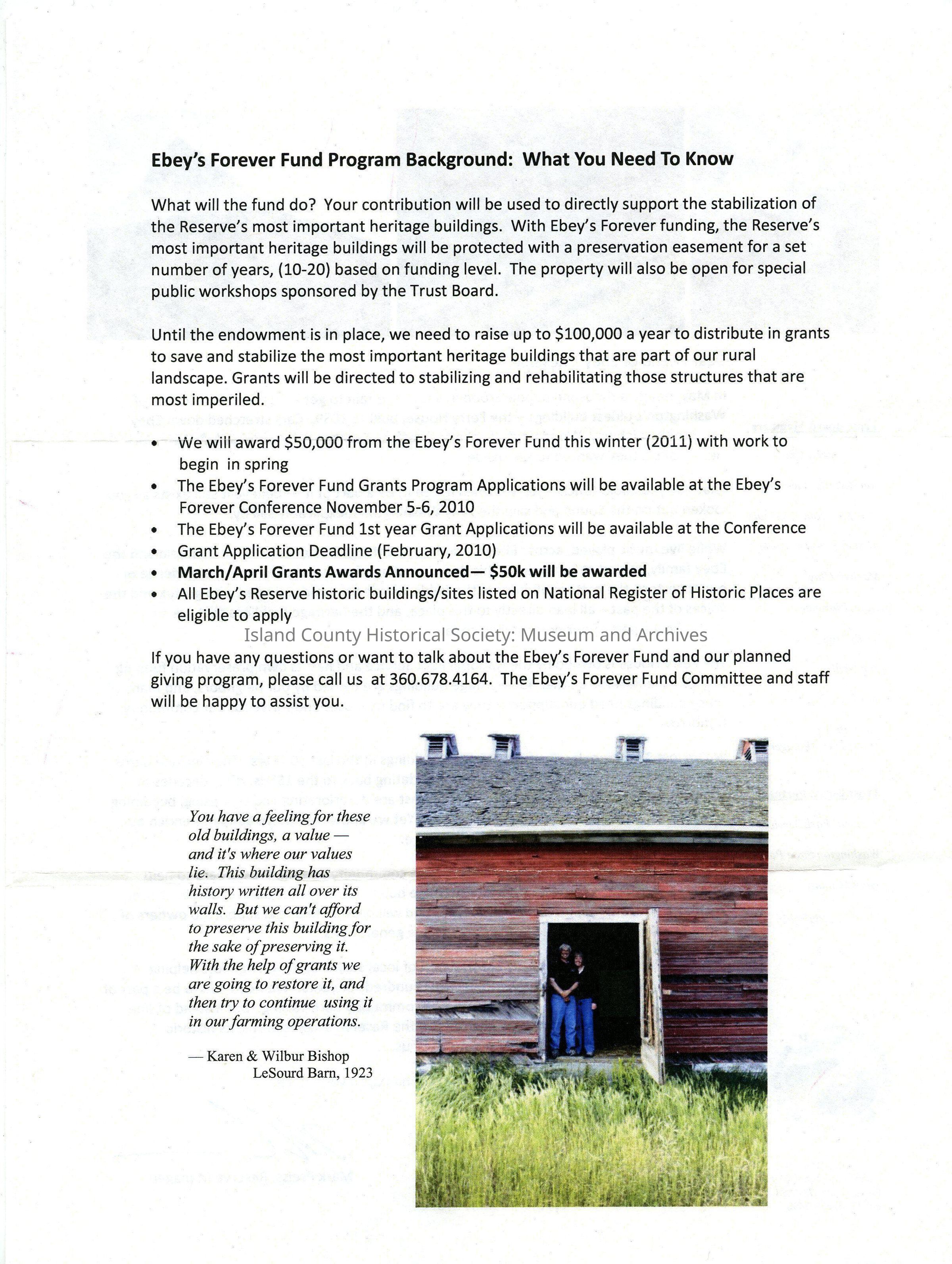 Letter and leaflet/information sheet on the Ebey's Forever Fund Program. 2 sides. First side is letter to Friend of Ebey's Reserve with info on history and event that occurred at the Ferry House. Notes historic buildings "lost" in the past 30 years. Encourages friend to continue supporting the reserve. Second side entitled: Ebey's Forever Fund Program Background: What You Need To Know". Informs reader of need to raise $100,000 a year for grants and need for grant giving, when applications will beceome available, when grant awards will be announced and who is eligible to apply. Provides telephone number. Quote below from Karen and Wilbur Bishop regarding the LeSourd Barn 1923 accompanied with photo of them in barn doorway. A4 white paper.