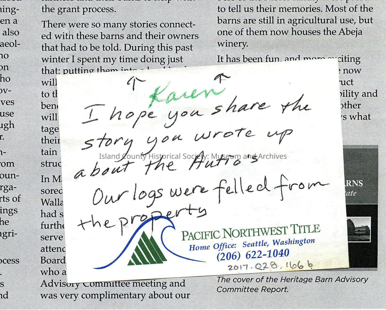 A sticky note stuck on the back page of 2017.028.166a. Sticky note produced for the Pacific Northwest Title. In black pen and green pencil, someone has scribbled a brief note in reference to what is written in the article it is attached to.