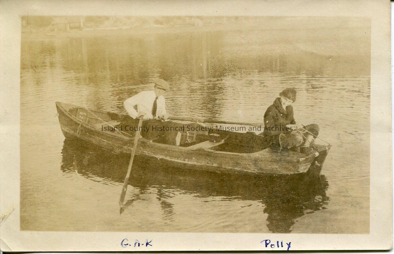 A photo of a couple in a boat. The boat in the water. The man has the ores in his hands and he is sitting in the middle of the boat. He is wearing a white shirt and dark-colored tie. He also has a hat on. The woman is sitting in the back of the boat. She is wearing a dark-colored outfit. The bottom of the photo says, "G.A.K.--Polly".