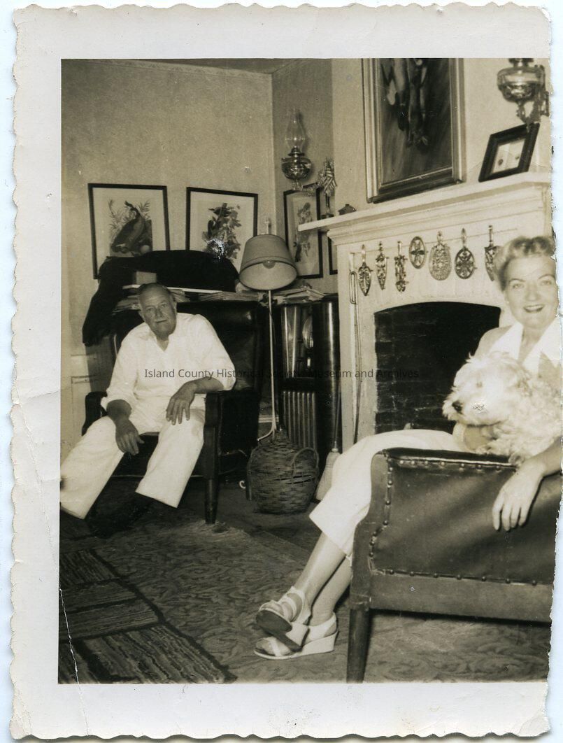 Photo of a couple sitting in large chairs on either side of a brick fireplace. She is wearing a dress, wedge sandles, and is holding small dog in her lap. He is wearing light casual clothers. The fireplace has probably brass decorations on the mantel front. Pictures above and on the mantel, on the walls. Sconces on the walls, floor lamp, bookcases behind the man, covered round basket beside his chair. On the back: Miriam & Jack Williams