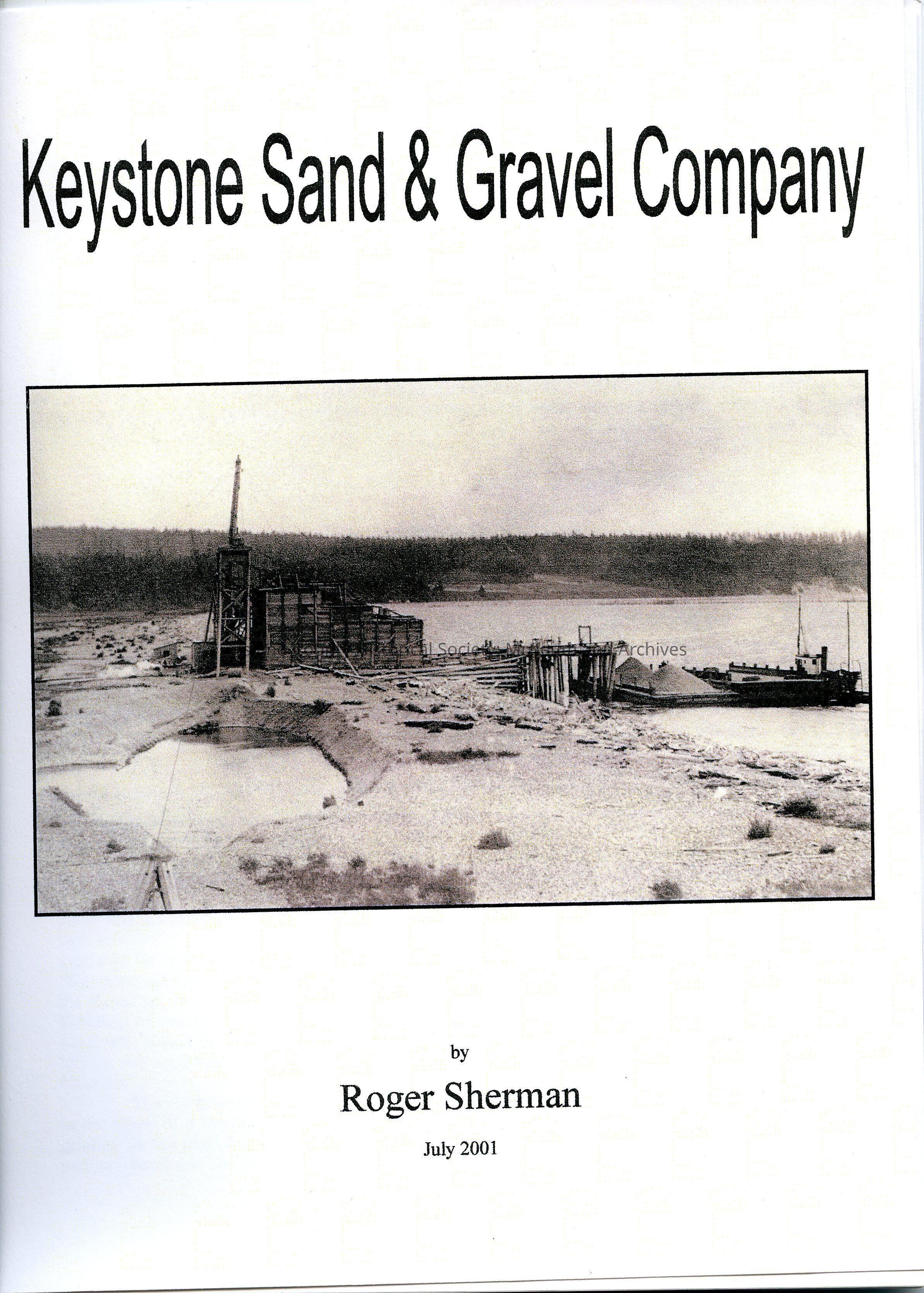 Keystone Sand & Gravel Company booklet by Roger Sherman. The booklet is held together with plastic tab binder. The picture on the front of booklet is of the Keystone Sand and Gravel Company with a fish trap in the background taken around 1915.Collection