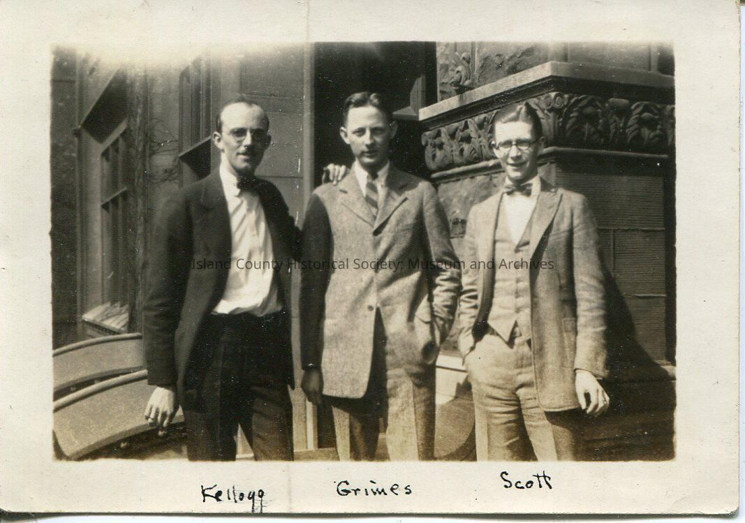 A black and white photo of three men standing in front of a building. All three men are wearing suits, one with a long tie and the other two with bow-ties. The men on the outsides are both wearing glasses. The bottom of the photo says, "Kellogg, Grimes, Scott".Lexicon