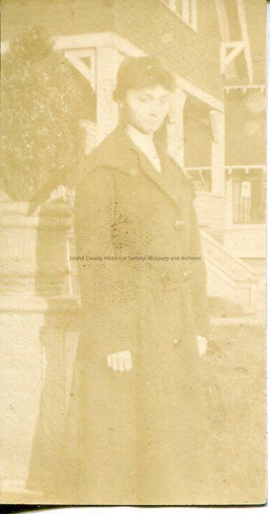 A small photo of a young woman wearing a dark-colored jacket. There is a house in the background. The back of the photo says, "Peusive (?) Polly, Feb. 16, 1918".