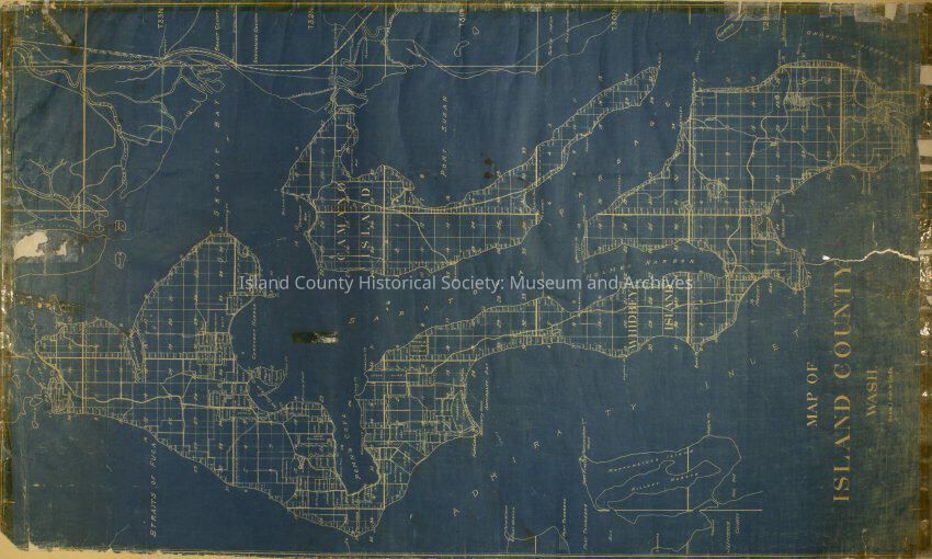 1928 Blueprint of Whidbey Island - Island County. This blueprint is printed on the back of the Coupeville town map. The map is has a blue background with some fading/damage in areas.