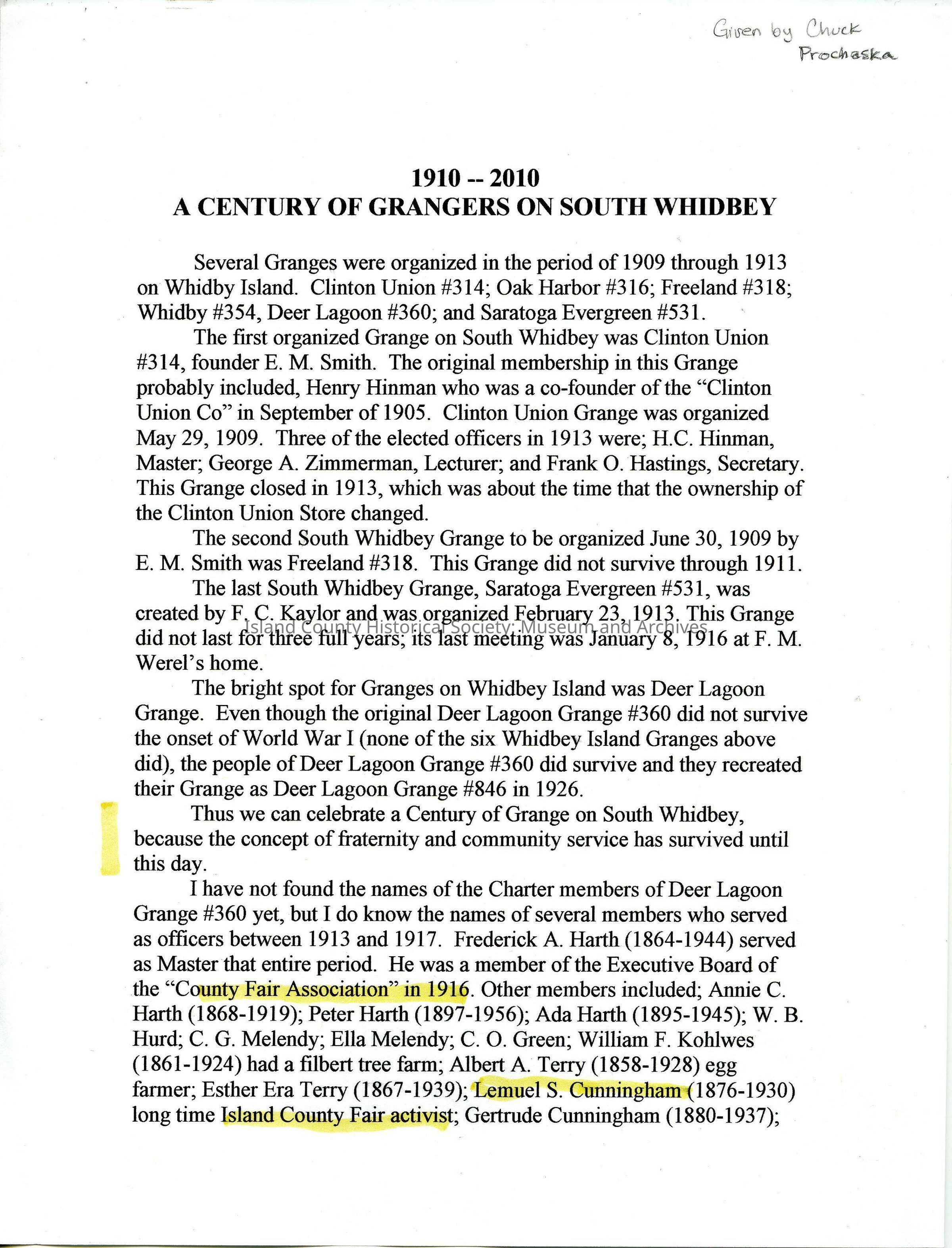 This document outlines the history of Grangers on South Whidbey from 1910-2010. The document lists the several granges that were organized in the period of 1909 through 1913 on Whidbey Island.