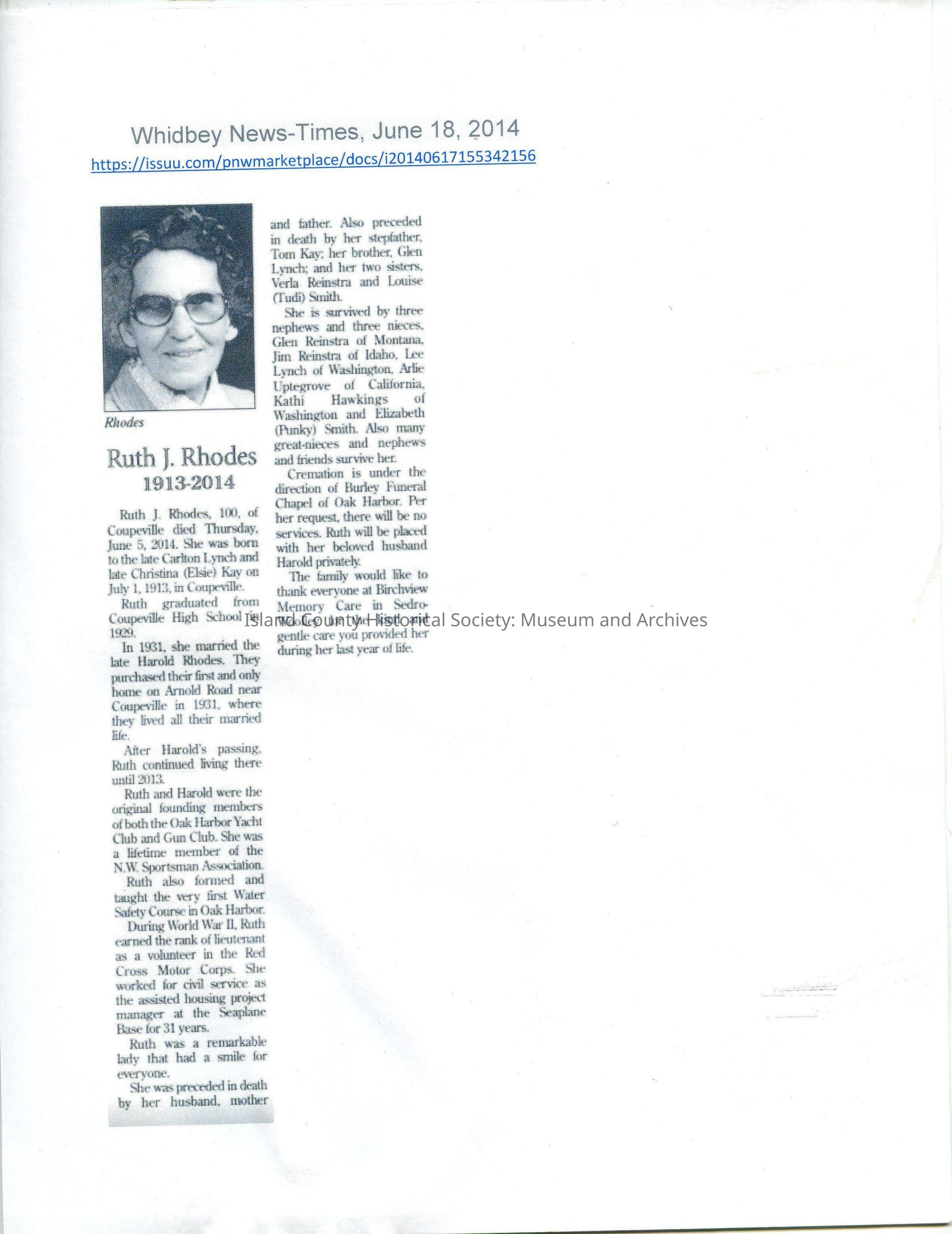 This is the obituary of Ruth J. Rhodes that was published in the Whidbey News-Times on June 18, 2014. Ruth J. Rhodes was born on July 1st,1913 and died June 5, 2014. Ruth graduated from Coupeville High School in 1929.