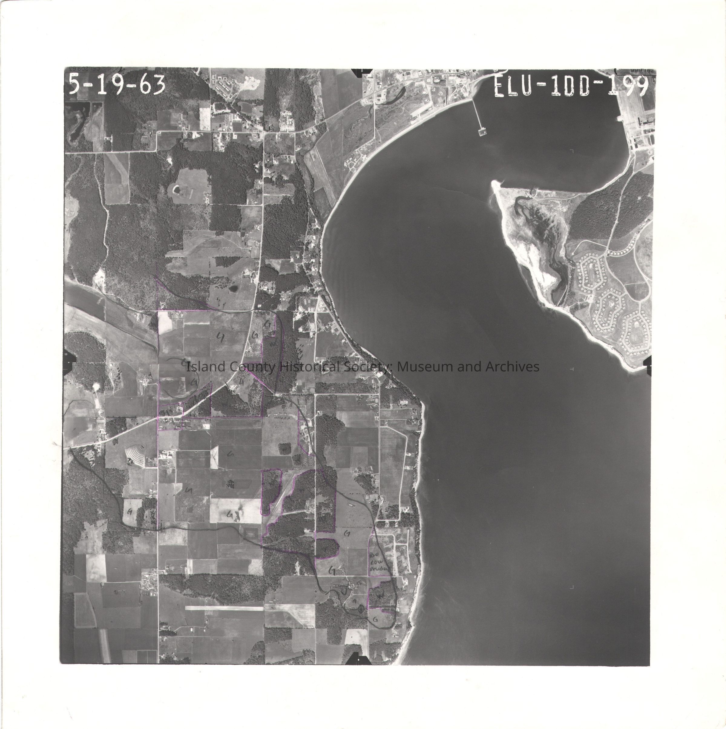 Donated by Island Conservation Adjacent to 2015.023.330 and 2015.023.332 5-19-63 ELU-1DD-199 Photo taken 19 May 1963 Oak Harbor Scenic Heights black and purple pencil lines and numbers in the left section of the image See GIS for digital copies.