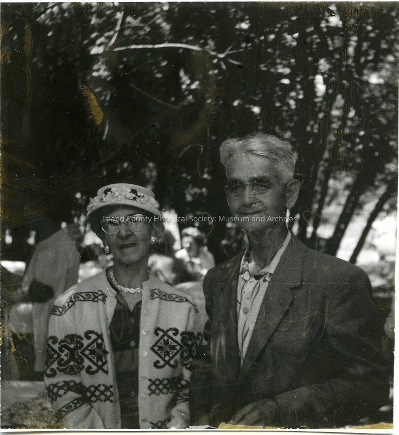 Photo of a man and woman standing under some trees. She is wearing a hat, glasses, necklace, earrings and patterned jacket. He is jacket and shirt. On the back: Pres. Herman & Mrs Margaret Wanamaker. Margaret and Herman Wanamaker 1962.