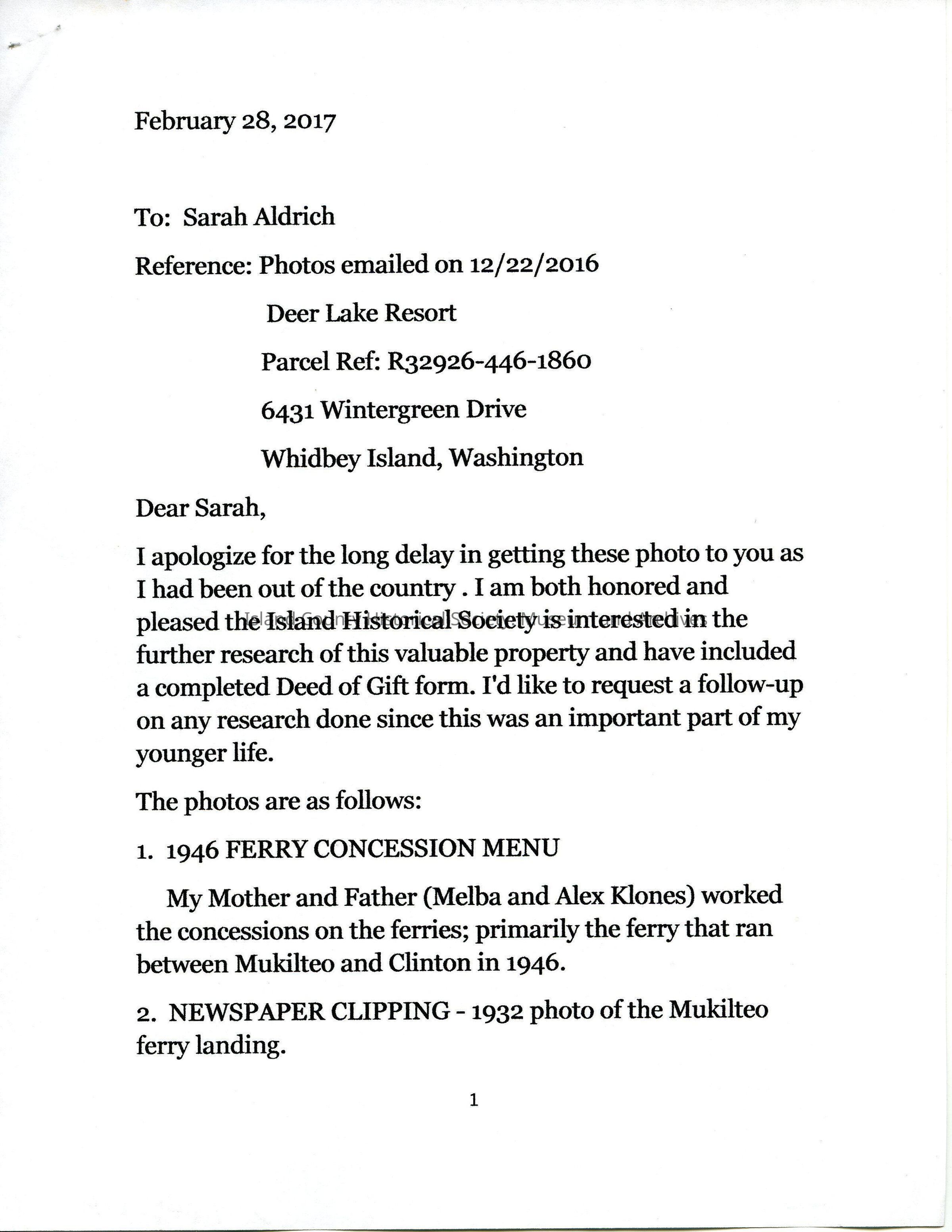 This is a correspondence letter from Sharon Edwards outlining the details of each photograph that she sent. 1. 1946 Ferry Concession Menu that her mother and father retained from working on ferry concessions. Primarily the ferry that ran getween mulkiteo and clinton inf 1946.