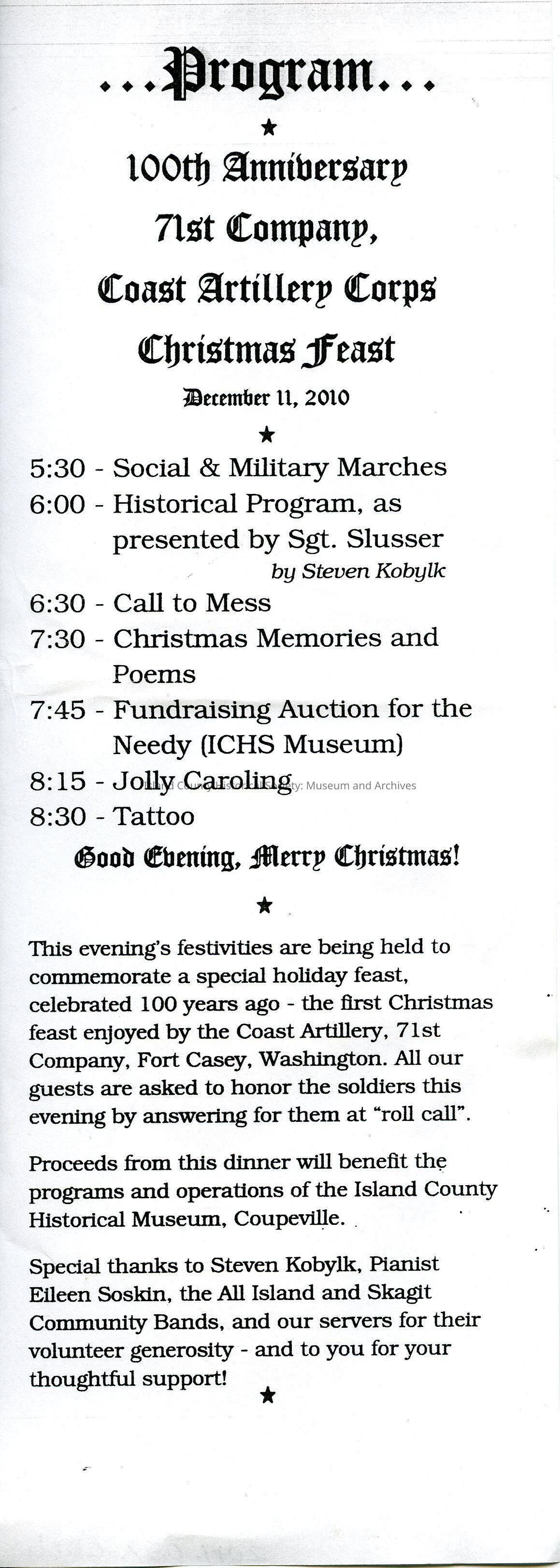 This document is a program for the 100th Anniversary 71st Company, Coast Artillery Corps Christmas Feast. At the bottom of the program it notes that this evening's festivities are being held to commemorate a special holiday feast, celebrated 100 years ago - the first Christmas feast enjoyed by the Coast Artillery, 71st Company, Fort Casey, Washington. All our guests are asked to honor the soldiers this evening by answering for them at "roll call."