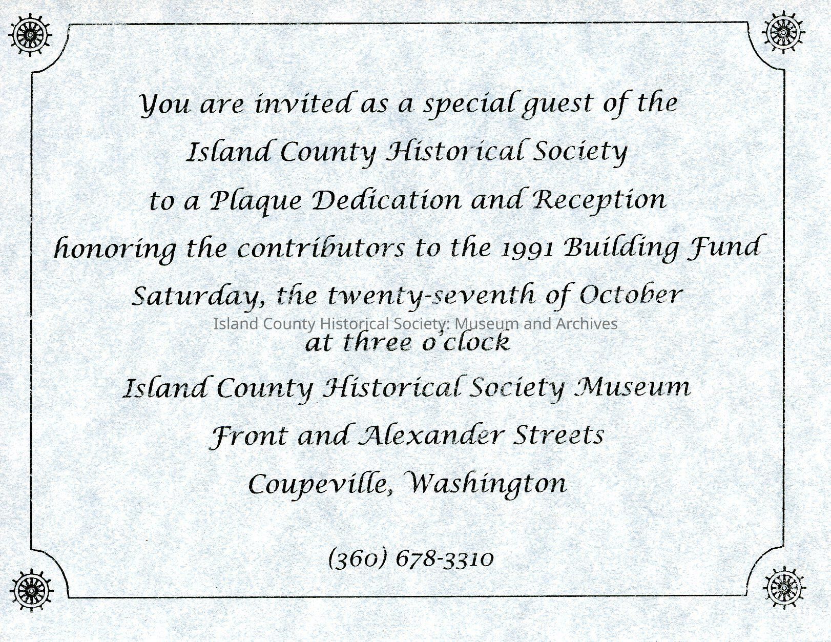 Invitation to the Island County Historical Society Plaque Dedication and Reception honoring the contributors to the 1991 Building Fund Saturday, the twenty-seventh of October at three o' clock.