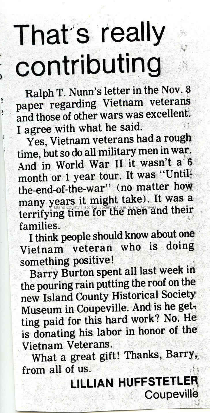 This newspaper clipping is about Barry Burton and his work on the roof of the new Island County Historical Society museum. The clipping is a photocopy of the original article and contains no date. It was written by Lillian Huffstetler of Coupeville.