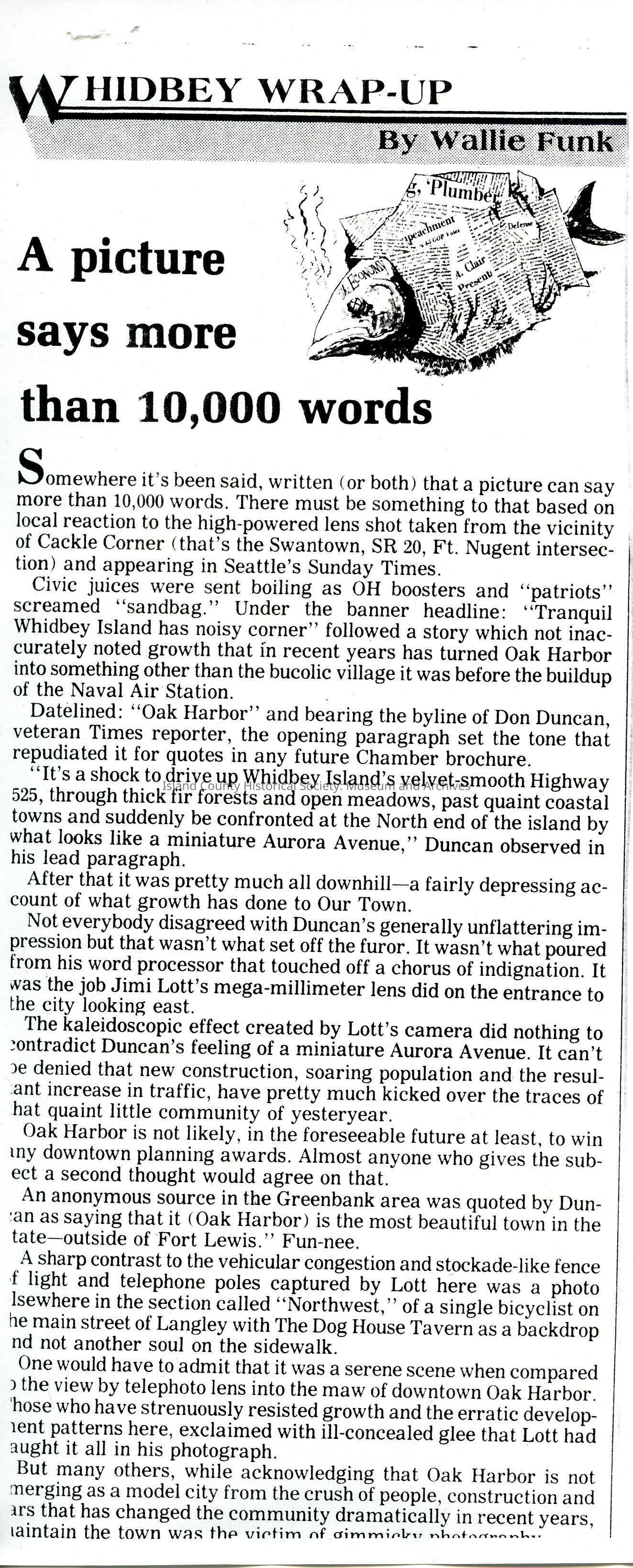 This photocopy of an article written by Wallie Funk highlights a photo of Oak Harbor taken by Jimi Lott. The photo which appeared the Seattle Sunday Times under the banner headline: "Tranquil Whidbey Island has a noisy corner" follows a story which inaccurately noted that Oak Harbor's rapid growth, due to the build of the Naval Air Station, left little to be said about the peaceful village of the past.Lexicon