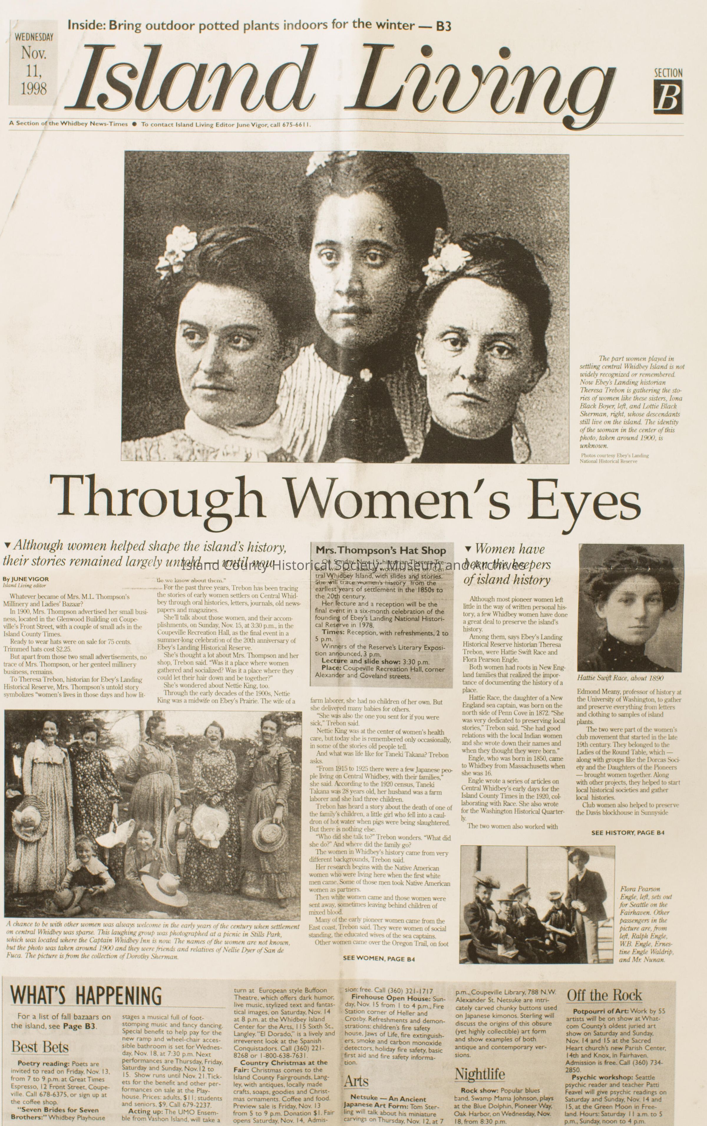 Whidbey News Times - Island Living article about the history of island life through the eyes of its women pioneers. The article contains four pictures of women who instrumental in the settling of central Whidbey Island to include: sisters, Iona Black Boyer and Lottie Black Sherman, Hattie Swift Race, Flora Pearson Engle, and Nettie King who was a midwife on Ebey's Prairie. The article written by June Vigor highlighted historian Theresa Trebon work on women's lives of Central Whidbey.Lexicon