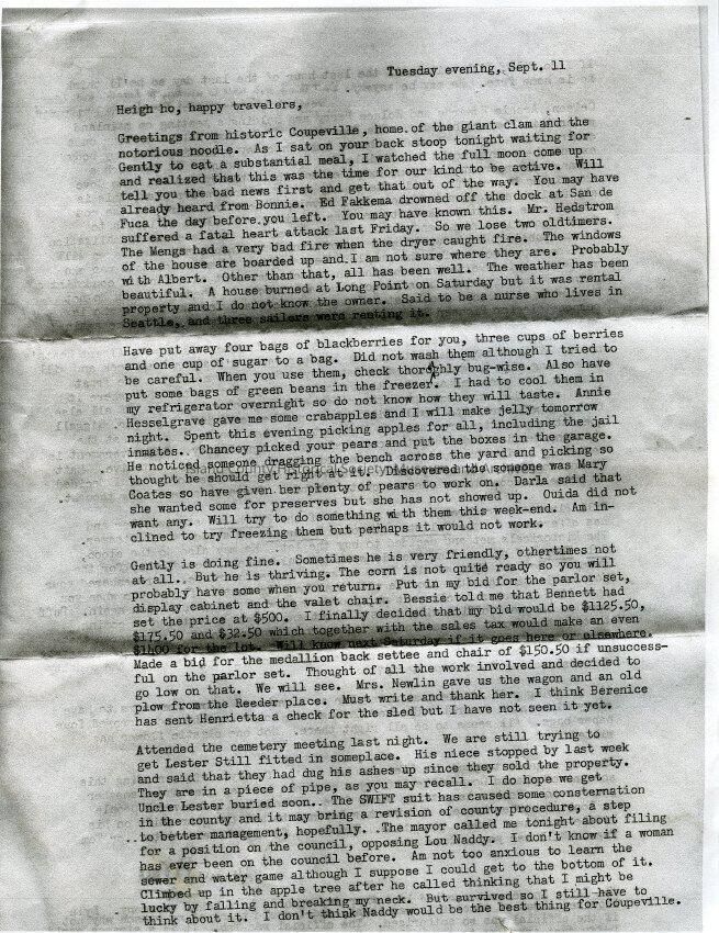 The "Giant Clam" refers to a very large clam shell on display in the shell shop in the first floor of the Calhoun building operated by the former Post master. In the letter Jimmie Jean explains that she is taking care of her sister, Mary Alice's, house cat and their vegetable garden while the Brooks family is visiting their daughter in England. Chancey is their neighbor across the street. Mary Coates sometimes had low threshold boundaries. Darla and Quida are friends. Henrietta is likely Henrietta Maxwell. Naddy is Lou.Lexicon