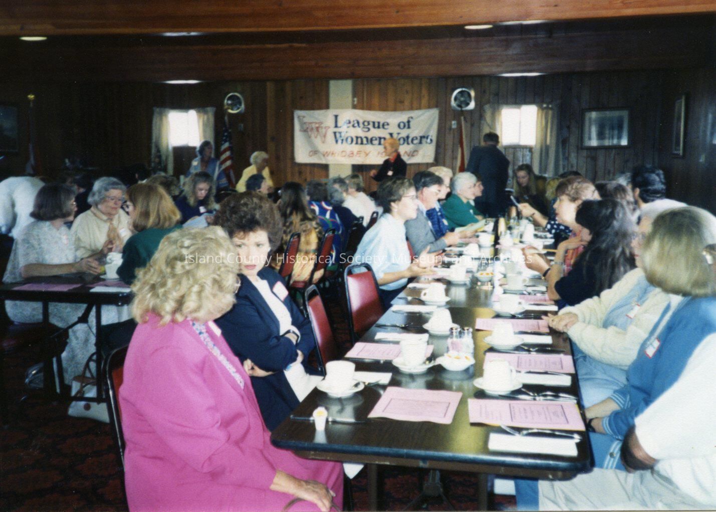 League of Women Voters of Whidbey Island. Women sit at long dinner tables at spring dinner. Others stand in front of banner identifying group.