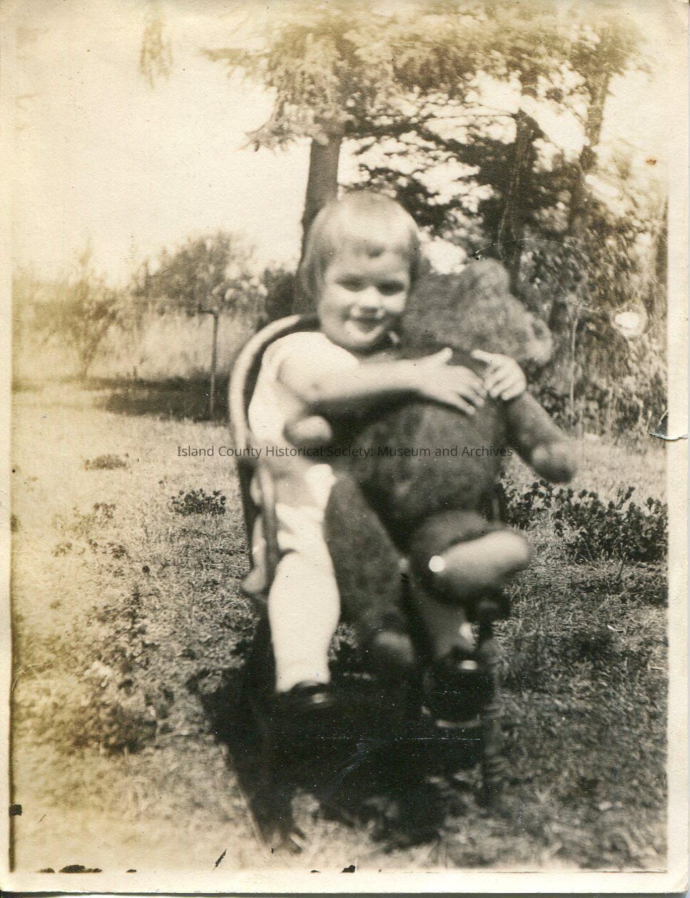 A photo of a child sitting in a wooden chair outside. The child is holding a teddybear that is almost as large as him/her. The child is wearing a white outfit. There are trees and tall grass in the background. The child is smiling at the camera.