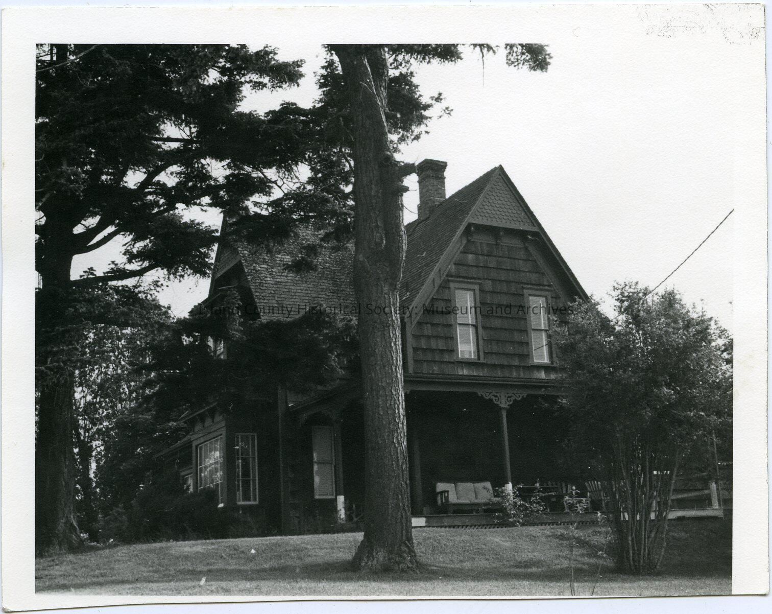 Photo of two-story house with two windows above a covered porch. Peaked roofs. Central chimney, Patio furniture/adirondack chairs on the porch. Cedar shake siding. Bay window on the left. Large trees and bushes. Curlicue design on the pillars for the porch. On the back: Rev. George Lindsey - 1889. Photo 1971. Church parsonage. Sticky note: 9. Congregational Church parsonage 1971 photo AT 94. The Home of Rev. George Linsdey in 1889.