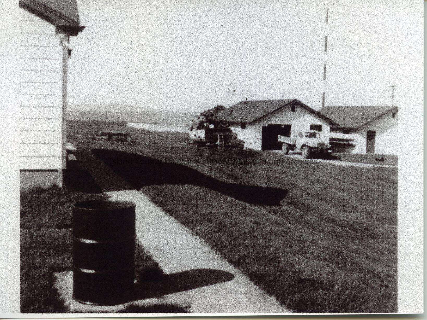 A photo of the buildings on Smith Island, with trucks by them. One building (Lighthouse?) is right on the left with a metal drum by it which is black.