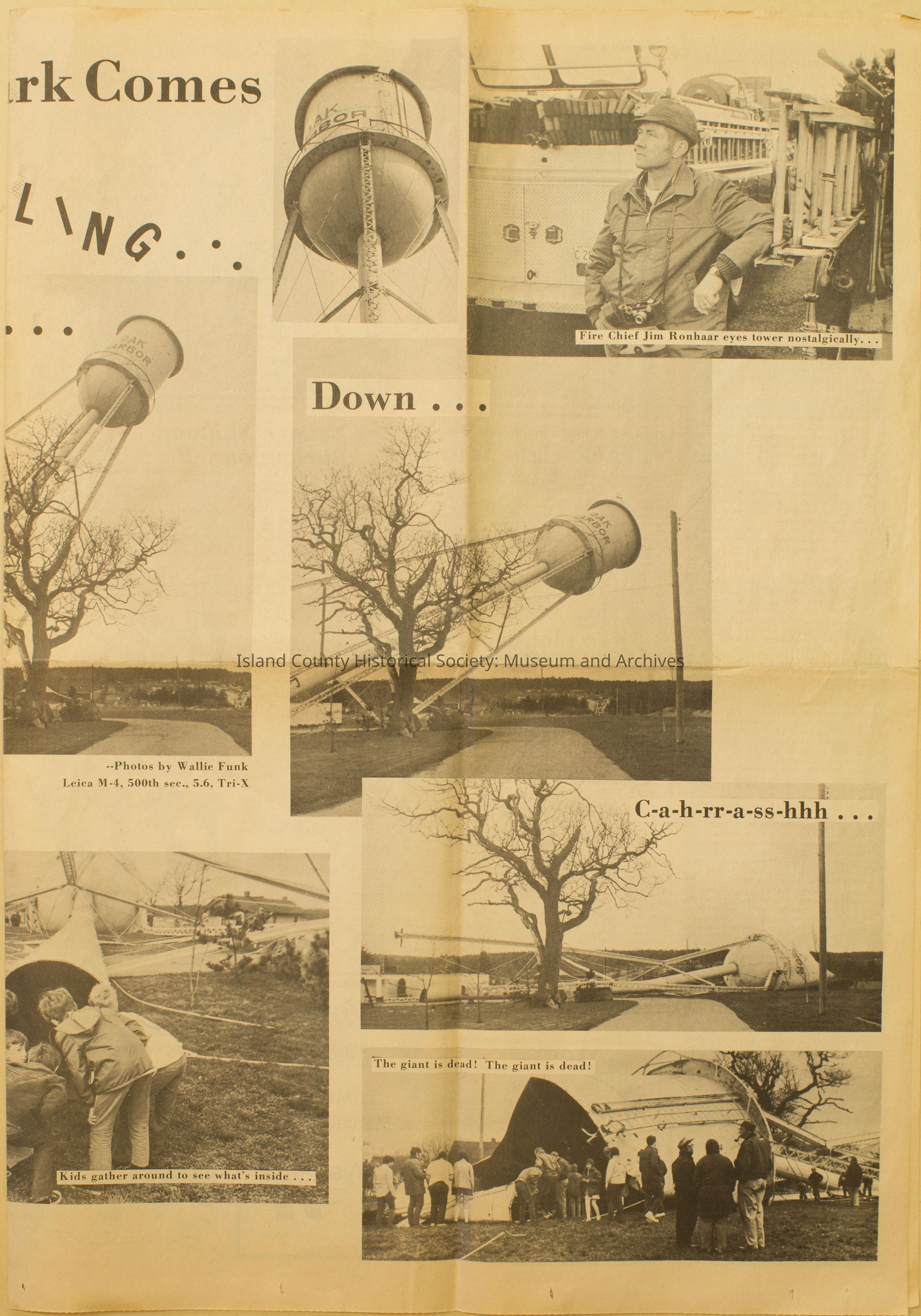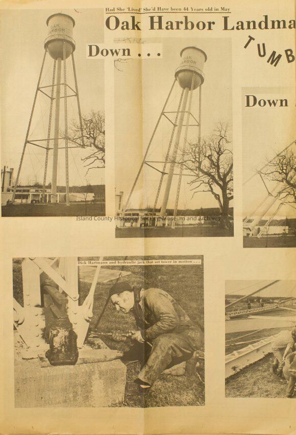 Whidbey News Times article dated March 30, 1972 about taking down the Oak Harbor Water Tower. Article was donated by The PBY -Naval Air Museum. Pictures in the newspaper article show Dick Hartmann working on hydraulic jack, Fire Chief Jim Ronhaar and the community watching the tower as it's taken down.