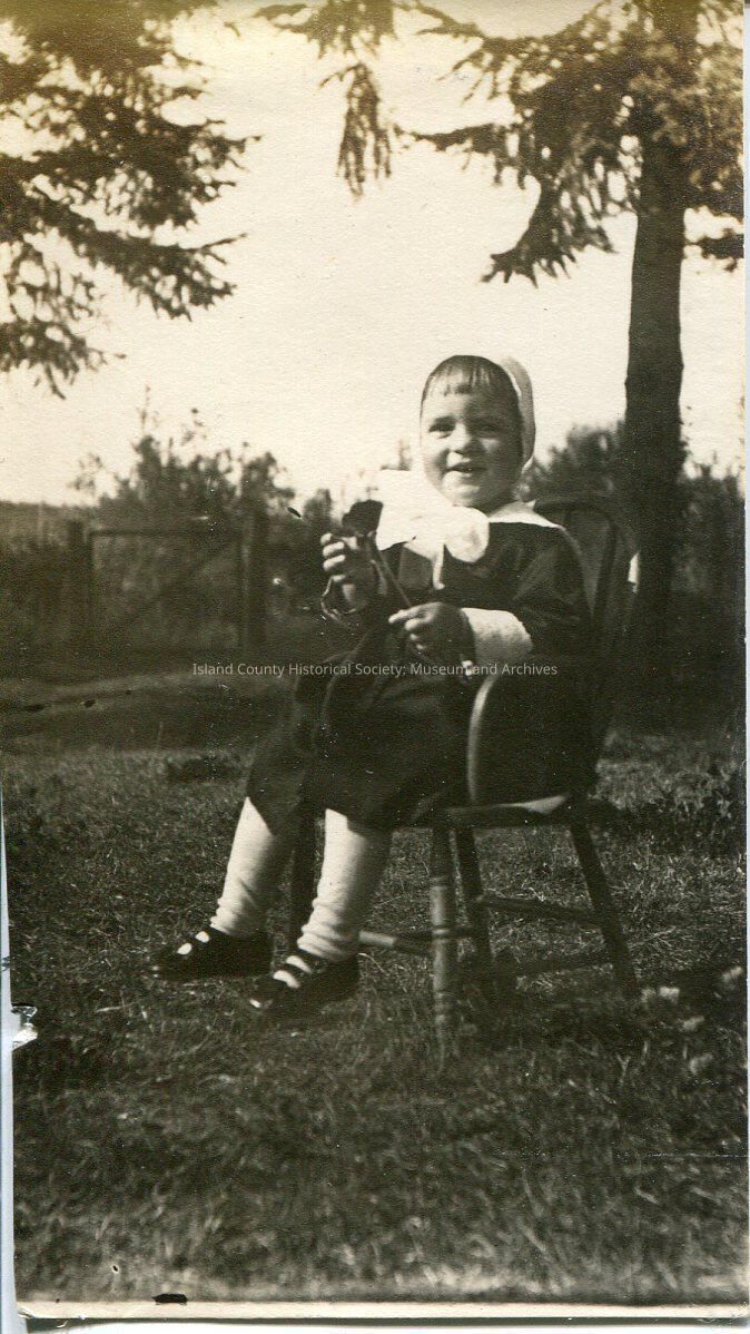 A photo of a young child sitting in a wooden chair outside. The child is wearing a dark-colored outfit, white socks, dark shoes, and a white bonnet. There is something in his/her hands (a flower?). The chair is sitting in a clearing in the grass. There is a fence and trees in the background. The child is smiling at the camera.Lexicon