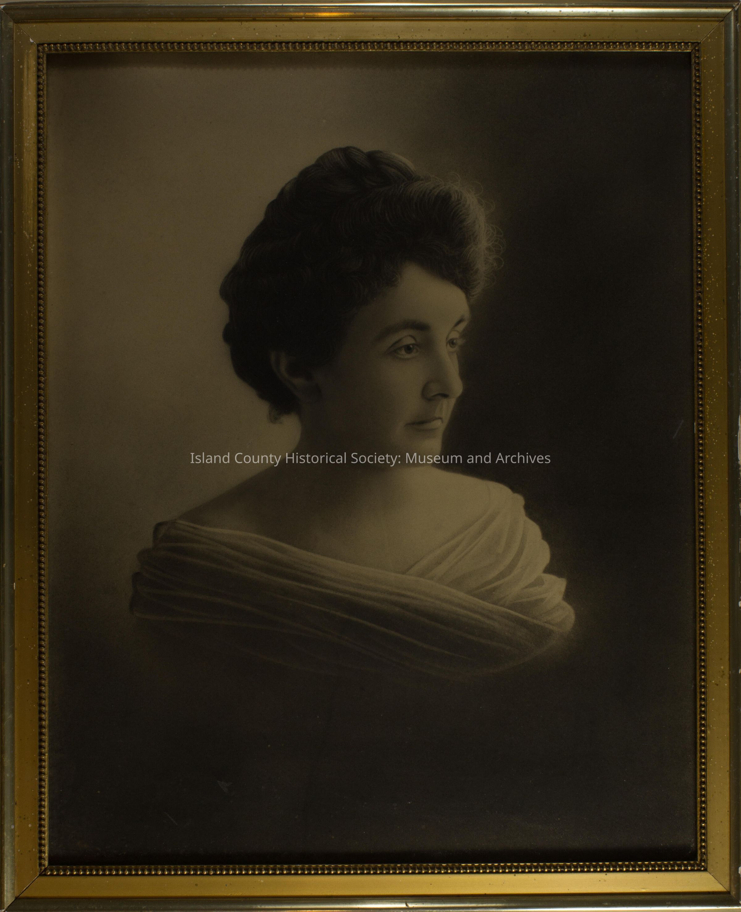 Framed picture of Maud Van Wormer. Maud was Mary Ebey's daughter and Ellison Ebey's stepdaughter. The photograph appears to have been enhanced to appear like a hand drawn portrait. In the photo Maud is wearing a drape that hangs on edge of shoulders with a completely bare neckline. Written on back of portrait: Mom, 27 years old, 1903, Maud Van Wormer.